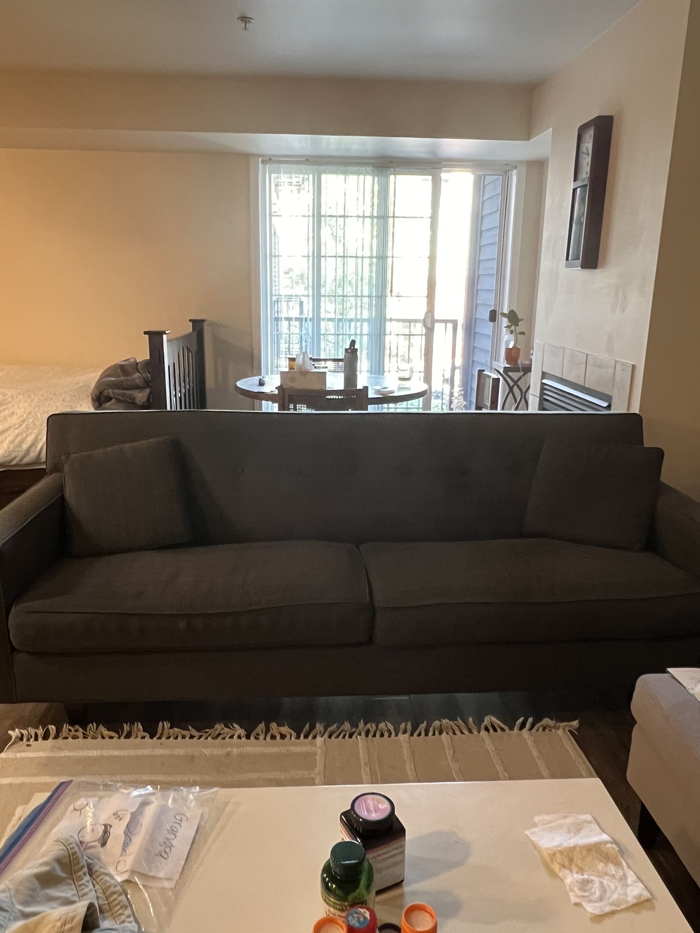 Used , Well kept extra long sofa Fabric dark charcoal with light grey Removable washable cover seat 85” long