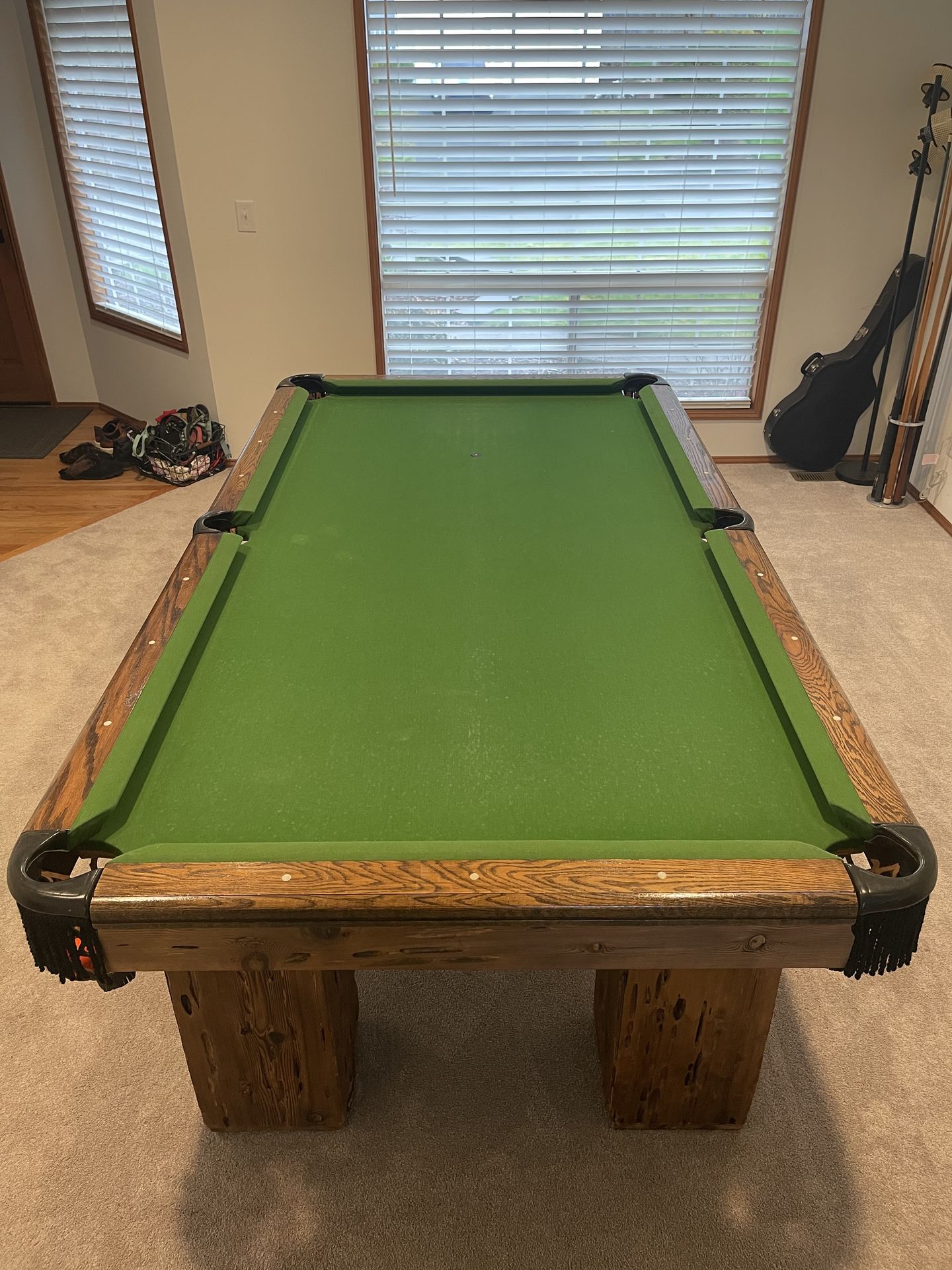 8ft worm wood pool table. One piece slab. Customer built by previous owner. Comes apart for easy moving. Slab is heavy, I would recommend at least two strong people and something flat and soft to haul it in.