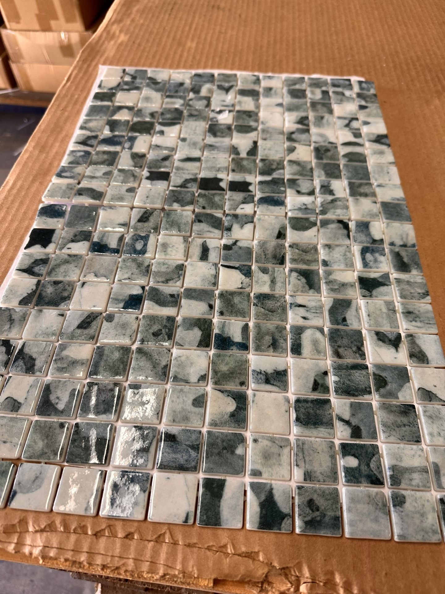 1x1 glass mosaic suitable for pools, indoor, outdoor, floors and walls 12x18 sheets Dot mounted 1680 sheets or 2500 sq ft $2 per sheet Shipping available Non negotiable Serious inquiries only Must pay taxes unless you have a reseller certificate Steps/corners also available in the colors shown