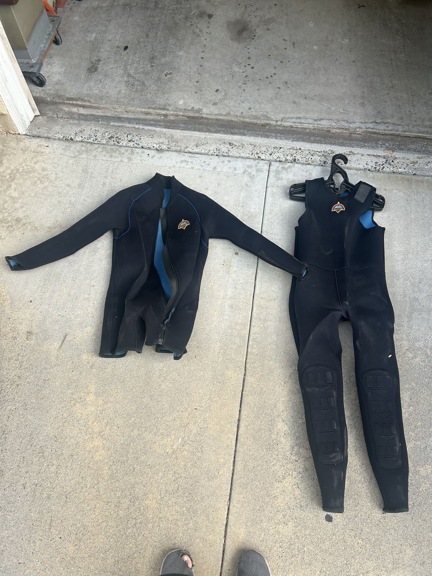 Mares Latitude Line 7mm - 2 piece wet suit "farmer John" style Zipper works well Seams are all still in good shape with the exception of one small(1-1.5") separation on the seat of the jacket. XXL --- I'm pretty sure. It's been awhile since I bought it and the tags have faded over time. I'm 6'6" 230lbs(25 yrs ago) and it was a great fit Hood IS NOT included Scubapro heavy duty BC hanger that's pictured IS included Items pictured are the items buyer will receive