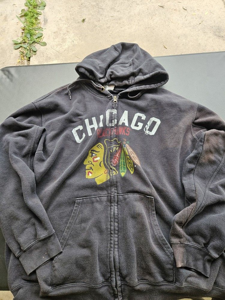 Chicago Blackhawks Y2K NHL Majestic Full Zip-Up Hoodie Size L Y2K Vintage [Bleach stains/flaws pics above]