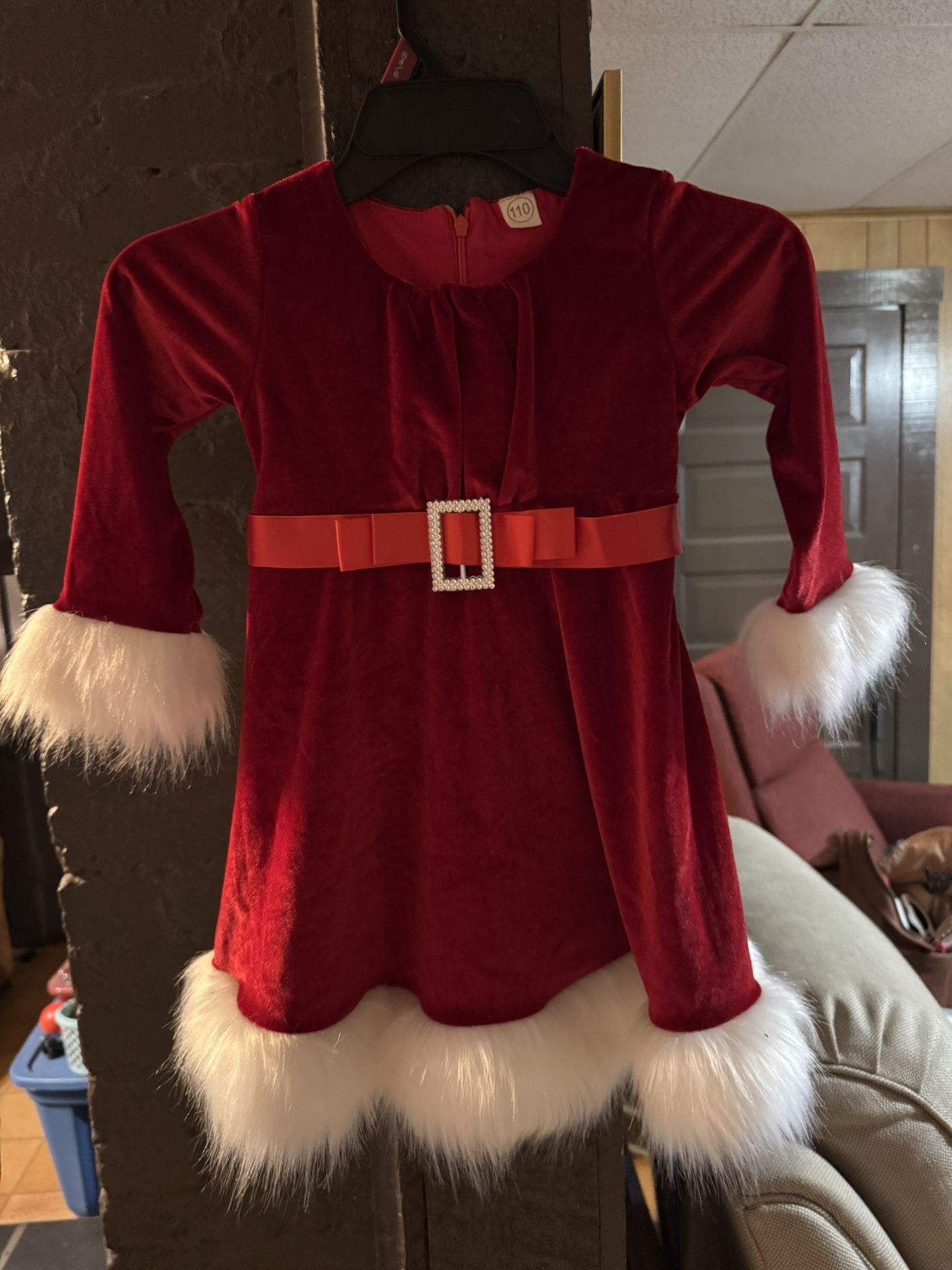 Little girls Christmas dress with white fluffy fur around the arm sleeves & the bottom of the dress worn once size small