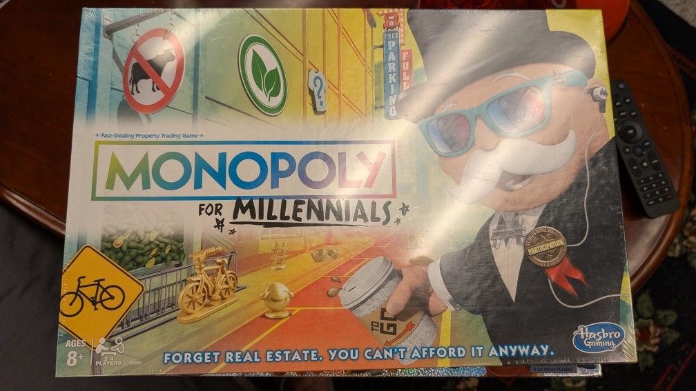 Same monopoly game updated for millennials. Never opened, still has shrink wrap on it.