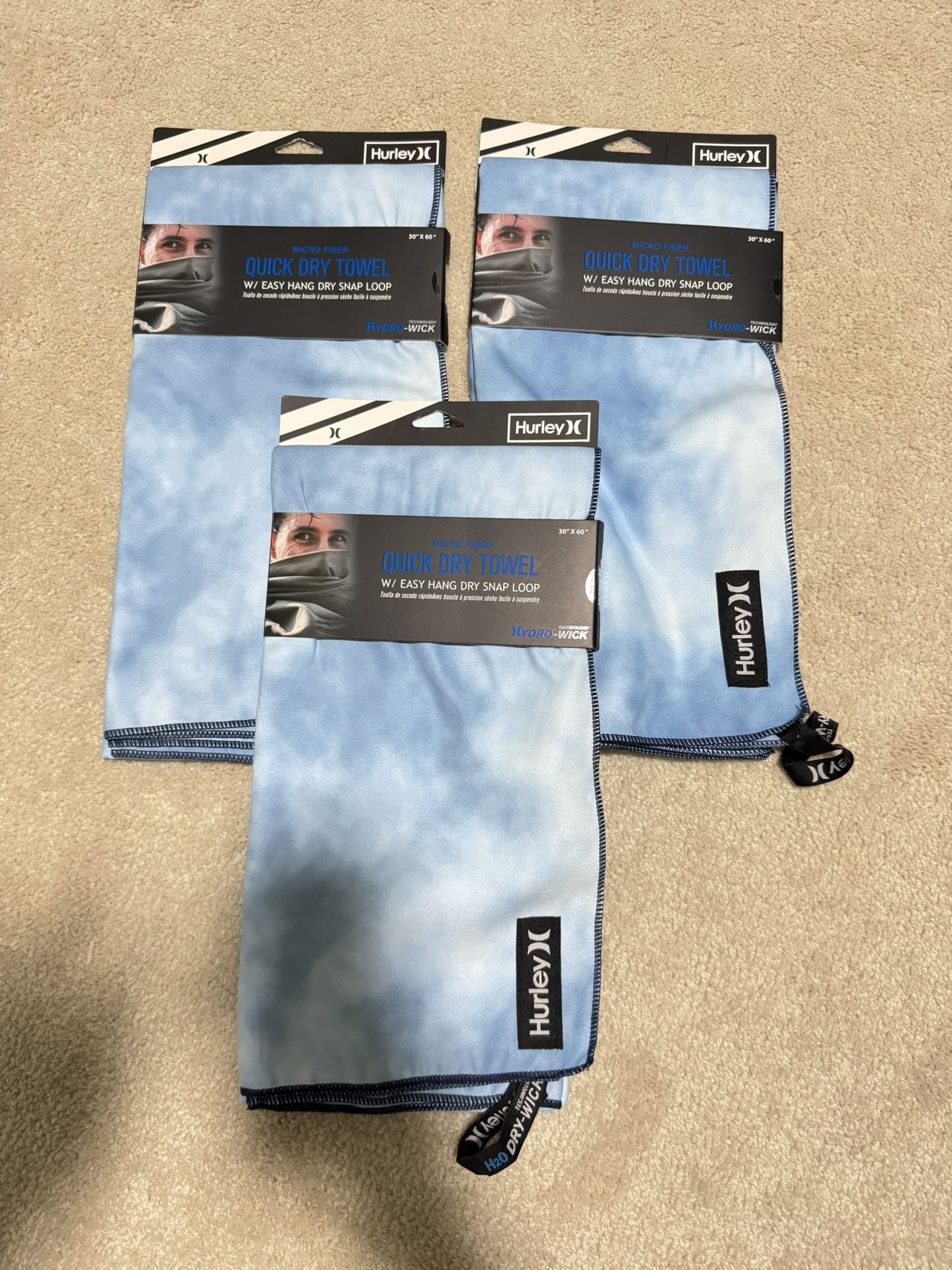 $15 each Color Light blue Brand Hurley Towel form type Towel for bath, beach, gym, yoga many more Material Microfiber Product Dimensions 60"L x 30"W * Skin-Friendly Microfiber Material - Made from ultrafine fibers that are woven together to create a soft and durable fabric, our microfiber towels for body are an ideal solution for your cleaning and wiping needs! * Fast Drying & Ultra Absorbent - No more waiting time for the next use! Our workout towel has a quick-drying property that features excellent performance in water absorption and diffusion. * Remove Sand Easily - With a single shake of our microfiber beach towels, sand particles will slide off with ease. Enjoy a fun day at the beach without worrying about the sand coming home with you! * Lightweight, Compact & Portable - Our camping towel is small in the pouch but big enough for body use! It measures 20" x 40", 30” x 60”, or 40” x 72”, making it ideal for sports, yoga, camping, and more. * Excellent Gift Idea - With its exceptional sweat absorption power, you can breeze through your workout. Make our fast drying towel an indispensable addition to your exercise arsenal