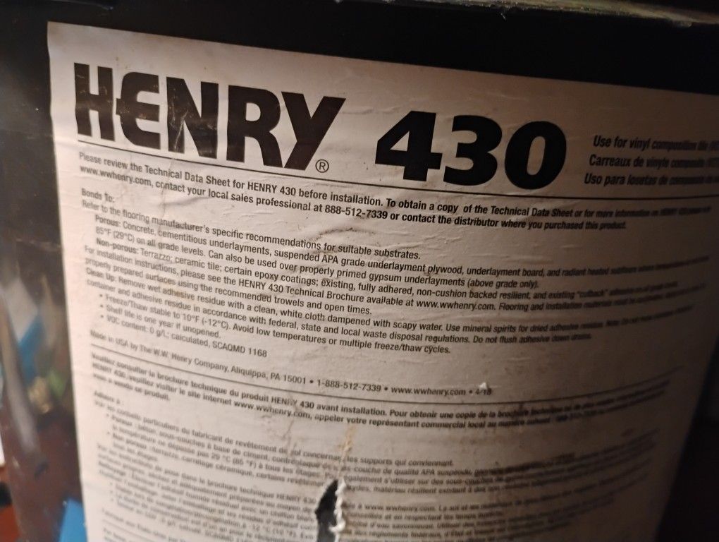Henry,s430 VCT floor glue 4gals new
