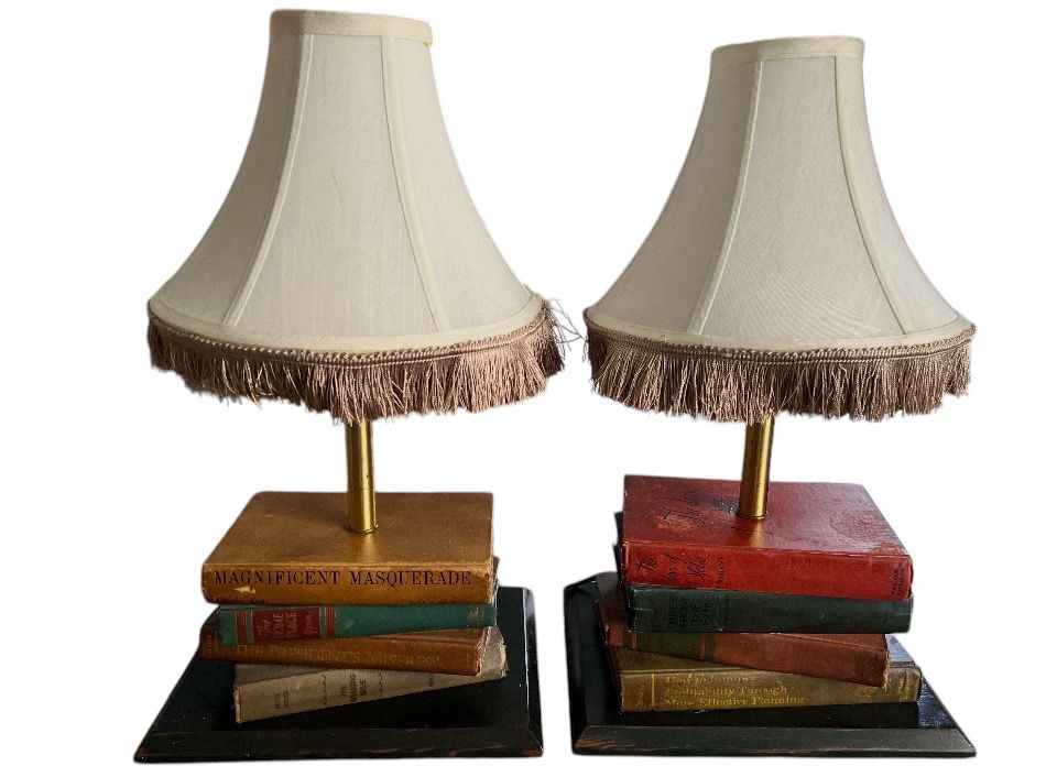 These vintage table lamps are a unique piece of folk art that will add character to any room. The lamp features a wooden base with a cone-shaped lamp shade included. The lamp is perfect for indoor use and has a beige and clear light color. The lamp is medium-sized, measuring 22 inches in height 22 inches long and base is 12x9. These are a must-have for collectors and art enthusiasts alike. $139 each or $260 for both