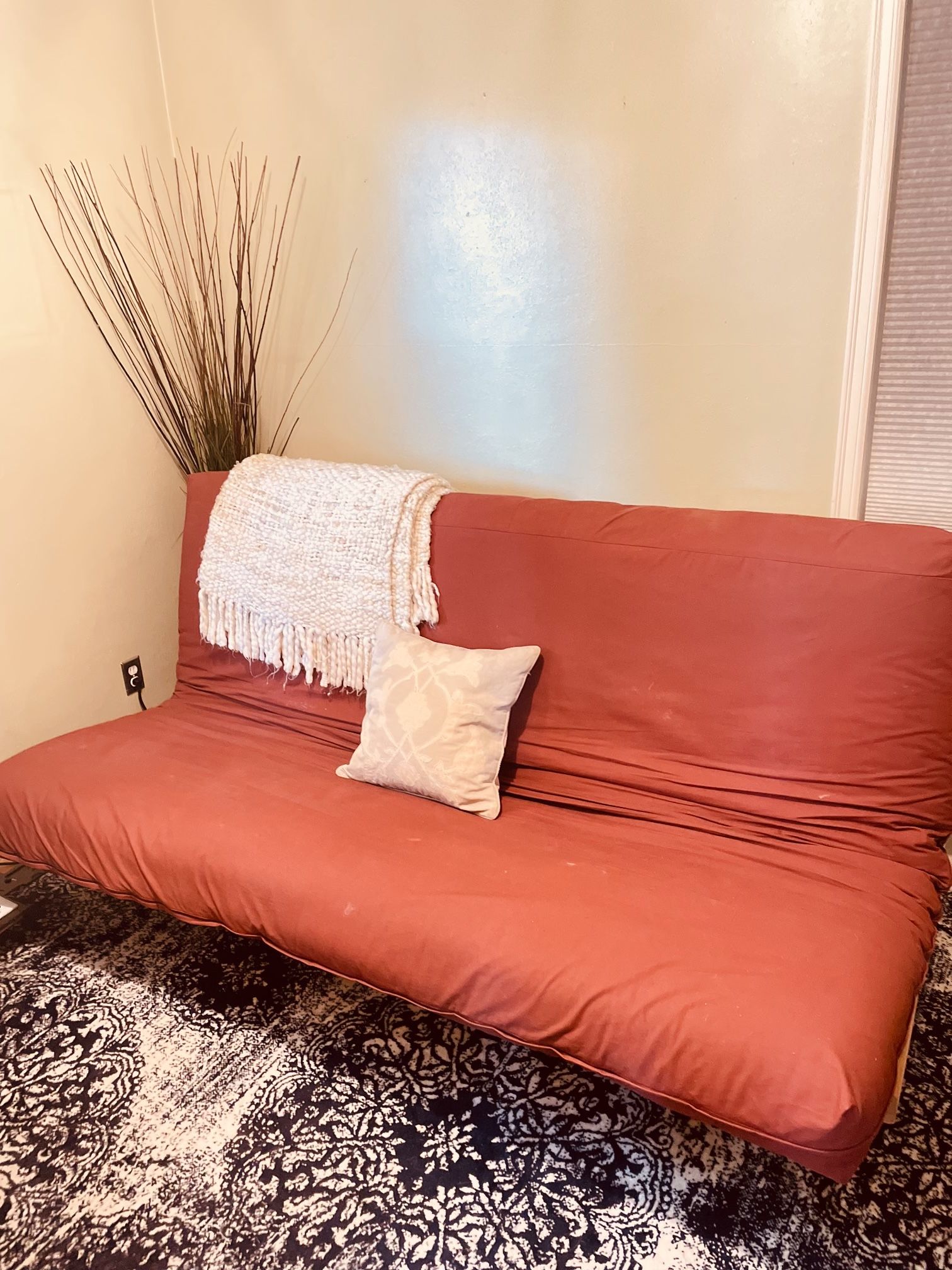 -Purchased/made at Rock Soft Futon in Portland. -Selling both Futon and Frame (Price of just the frame can be seen in the photo) -Also willing to sell its two queen premium latex toppers, one 3 inch, one 5 inch if you’re interested. -Converts from a Couch to a Bed -Queen Deluxe version -Slept on for 2 years when I lived in a Studio. Always with a topper/protective cover over it. -From a home with a dog (always covered but fair condition) -You must be able to pick it up. Futon will be rolled with the frame in 2 pieces. I do not have a plastic cover for it.