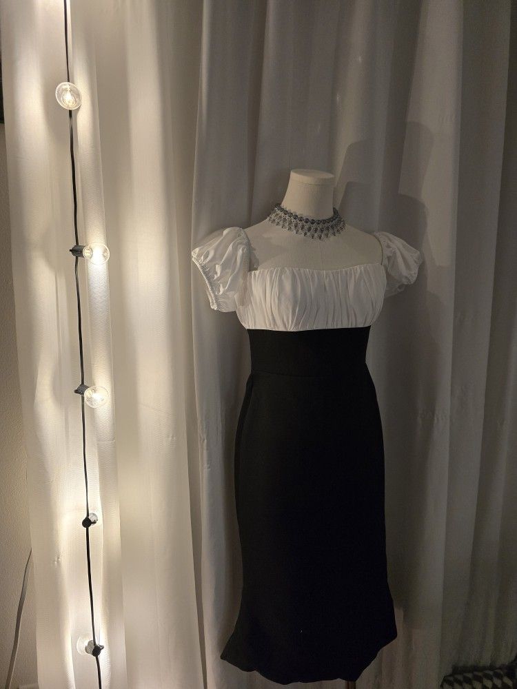 Black and white satin bodycon midi cocktail dress • Color: Black & White • Fabric: Satin • Style: Bodycon, off-shoulder • Length: Midi • Condition: Brand new, never worn • Size: Best fits US 4–6 (please see photos for fit reference) Two sizes available Elegant and flattering silhouette—perfect for cocktail parties, date nights, or formal events.