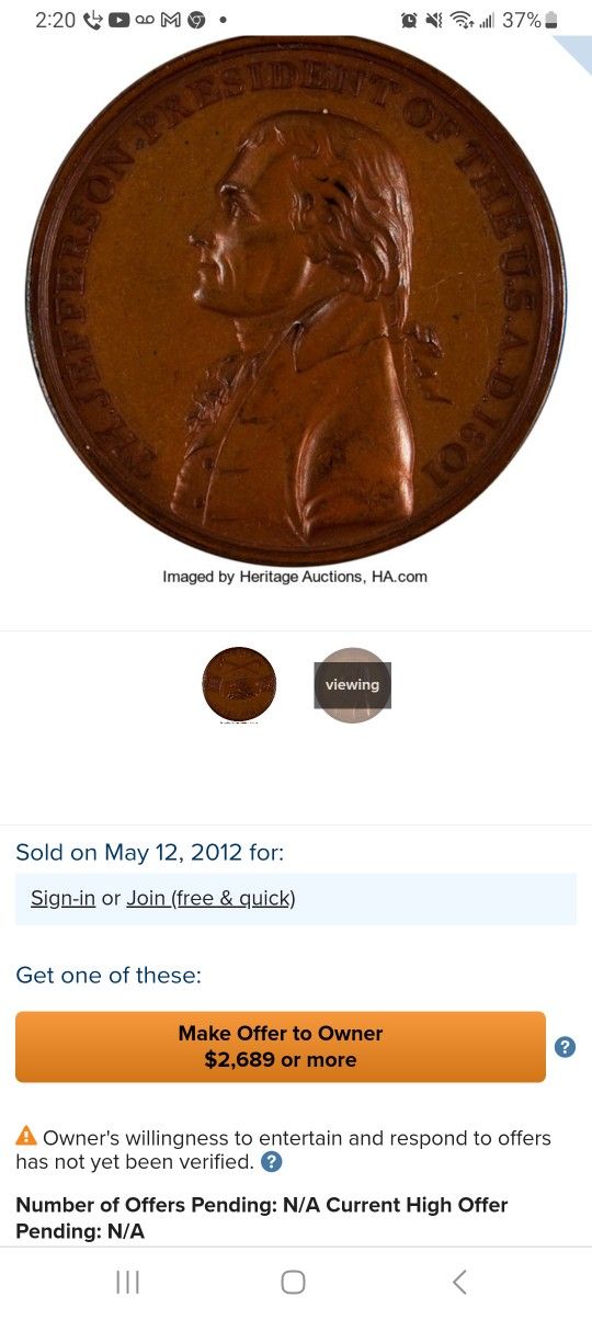 Selling a 1801 Thomas Jefferson peace and friendship coin make me an offer