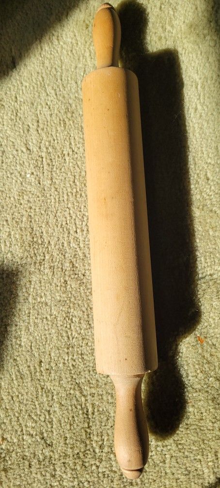 This rollong pin has been in regular use for more than 80 years. It is maple wood, 10" long with maple wooden handles.
