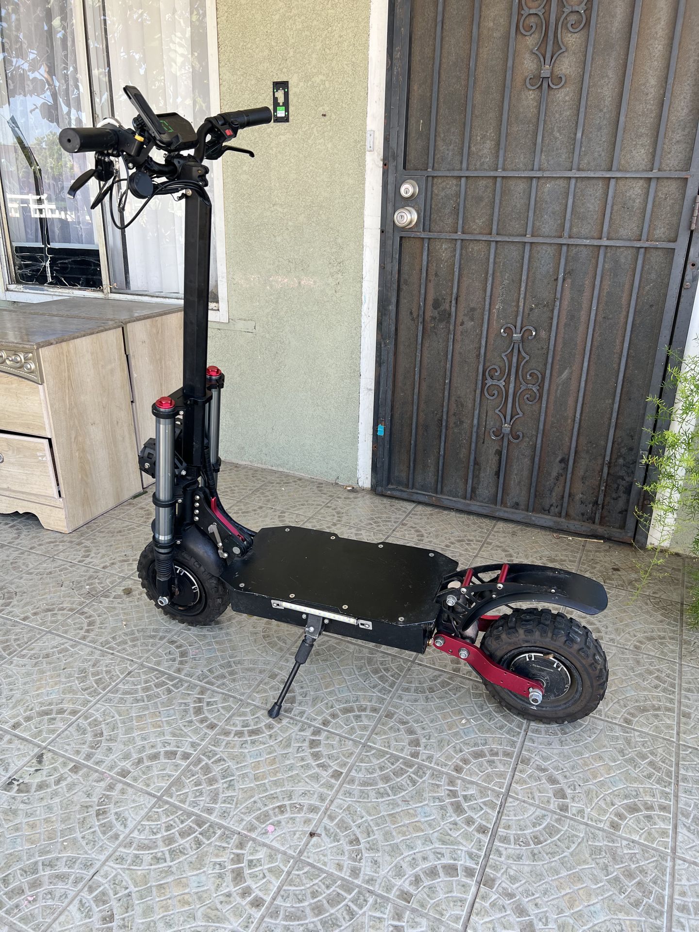 This Teewing X5 electric scooter for adults provides a powerful dual-motor system with 6000W of power, a 60V 38Ah lithium battery, and a top speed of 55 mph. X5 has a range of up to 75 miles Fully Charged and is constructed with 11 Hybrid tires and front and rear hydraulic disc brakes for enhanced safety and stability. X5 e-scooter offers front long-distance hydraulic shock absorption and rear high-end damping hydraulic shock absorption. Comes with Key Fob