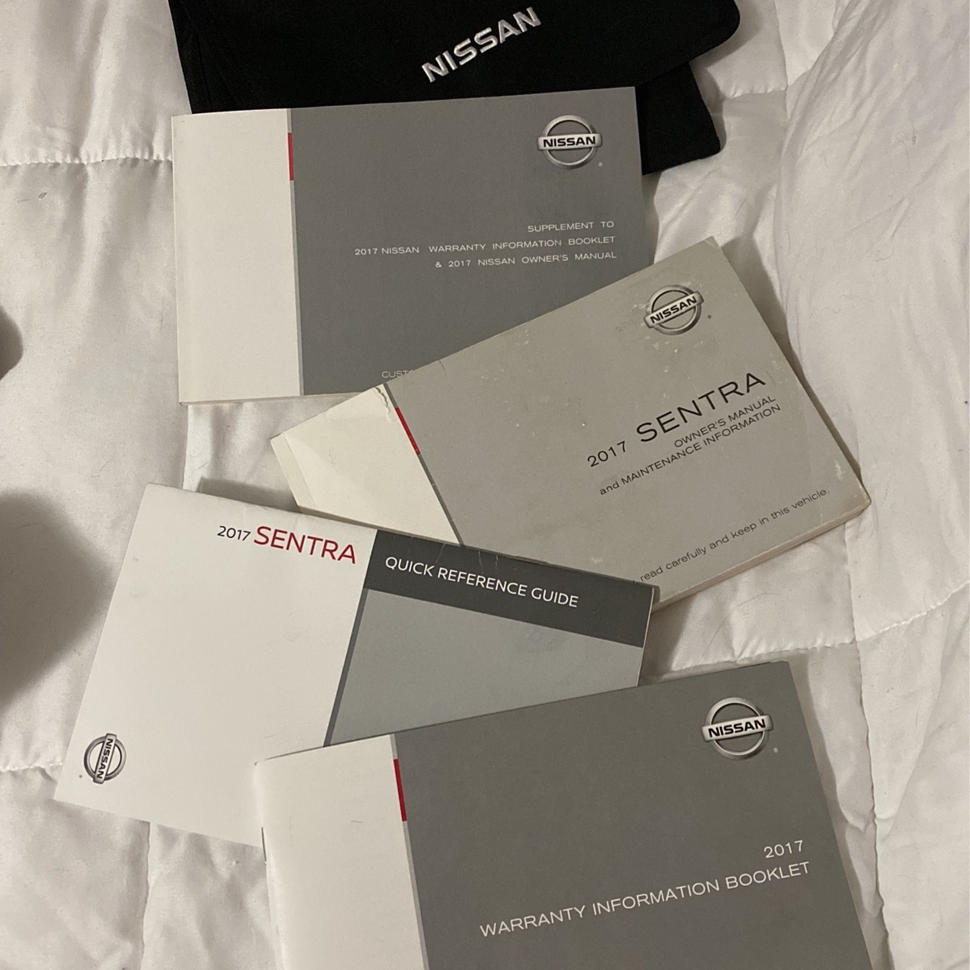 Nissan 2017 Sentra Owner’s Manual, Quick Reference Guide, Booklet Holder, warranty info booklet and supplement to warranty booklet. In great condition