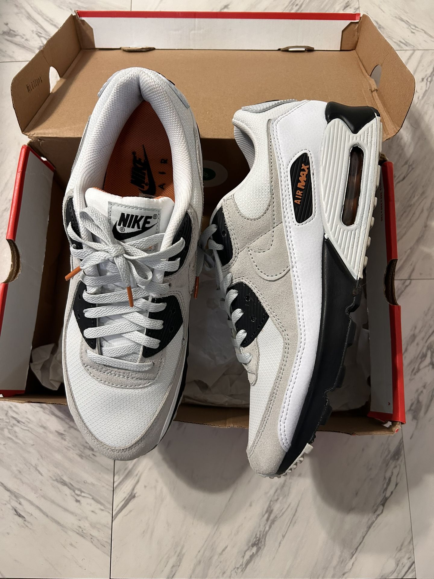 This is a great pre-owned pair of men's Nike Air Max 90 sneakers in size 12. the color is white with black and hot curry accents lol. The upper material is mesh, and the shoes belong to the Nike Air Max product line. The design is known as "White Black Hot Curry" and is a popular choice for athletic wear. 10/10 condo