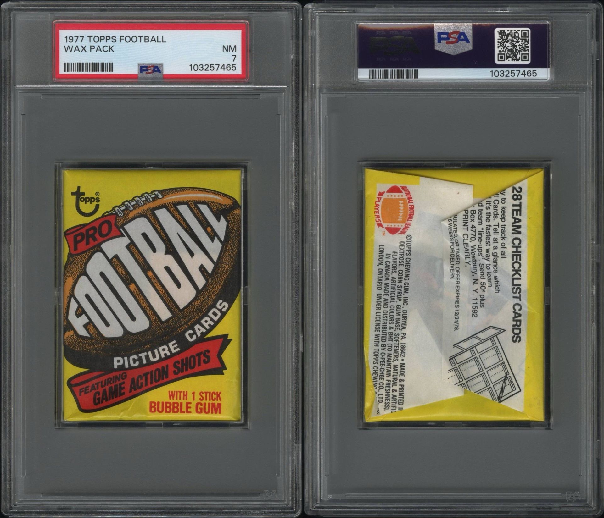 Offered is an original 1977 Topps Football Unopened Wax Pack PSA 7 NM. GREAT FIND! NEW PSA QR LABEL = TOUGHEST GRADES This VINTAGE and SEALED pack from Topps 1977 football series could contain a Mint or Gem MT example of any of the stars of the day, which in this era includes Harry Carson rookie, Walter Payton, Roger Staubach, Terry Bradshaw, Steve Largent rookie, Joe Greene, Jack Lambert, Mel Blount, Lynn Swann, Dan Fouts, Art Shell, Mike Haynes, Franco Harris, Randy White, Jack Ham, Mike Webster and OJ Simpson. Feel free to contact me with any questions. ALL SALES ARE FINAL. Please browse my other items that I have posted on OfferUp — lots of great stuff!