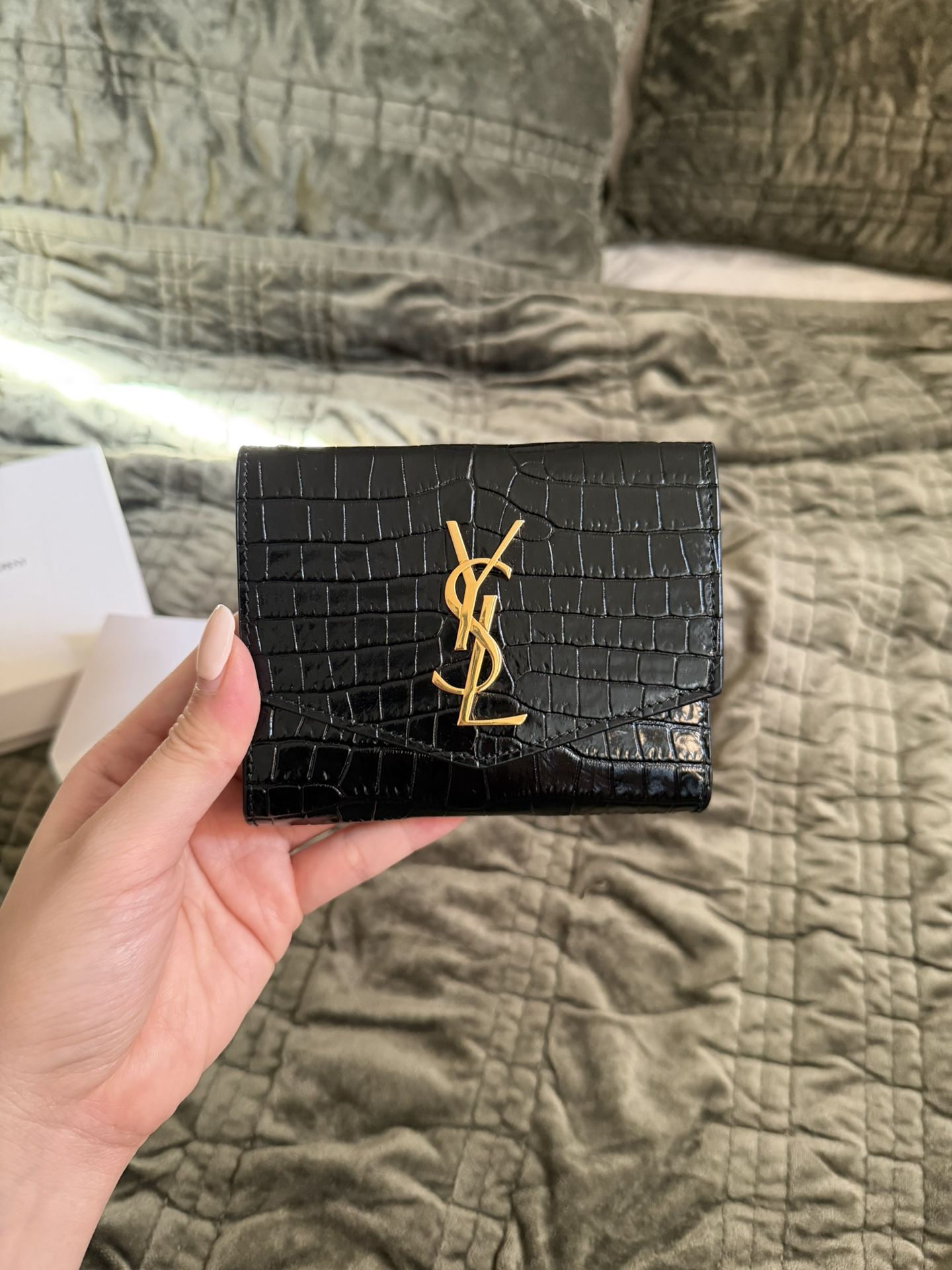 YSL Uptown Compact Bifold Wallet In Black Crocodile-embossed Shiny Leather