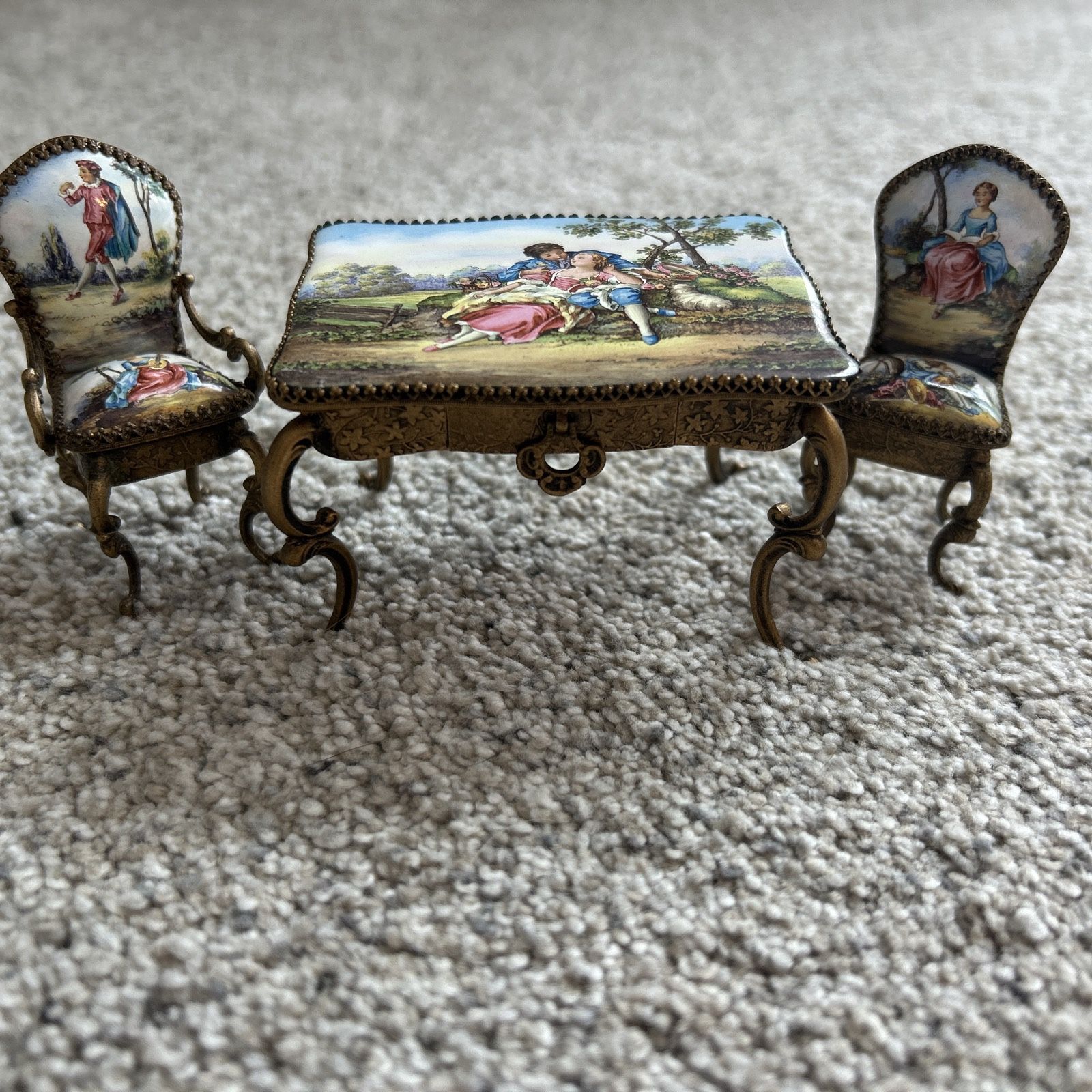 This antique enamel miniature table with two chairs depicts a beautiful a courting scene, stamped Austria, is a unique and vintage piece that would make a charming addition to any dollhouse or miniature collection. Austria stamped on both the bottom of the table and the bottom of drawer, which opens and closes. Chairs scenes depict two unique complementing scenes. Beautiful piece is very good condition.