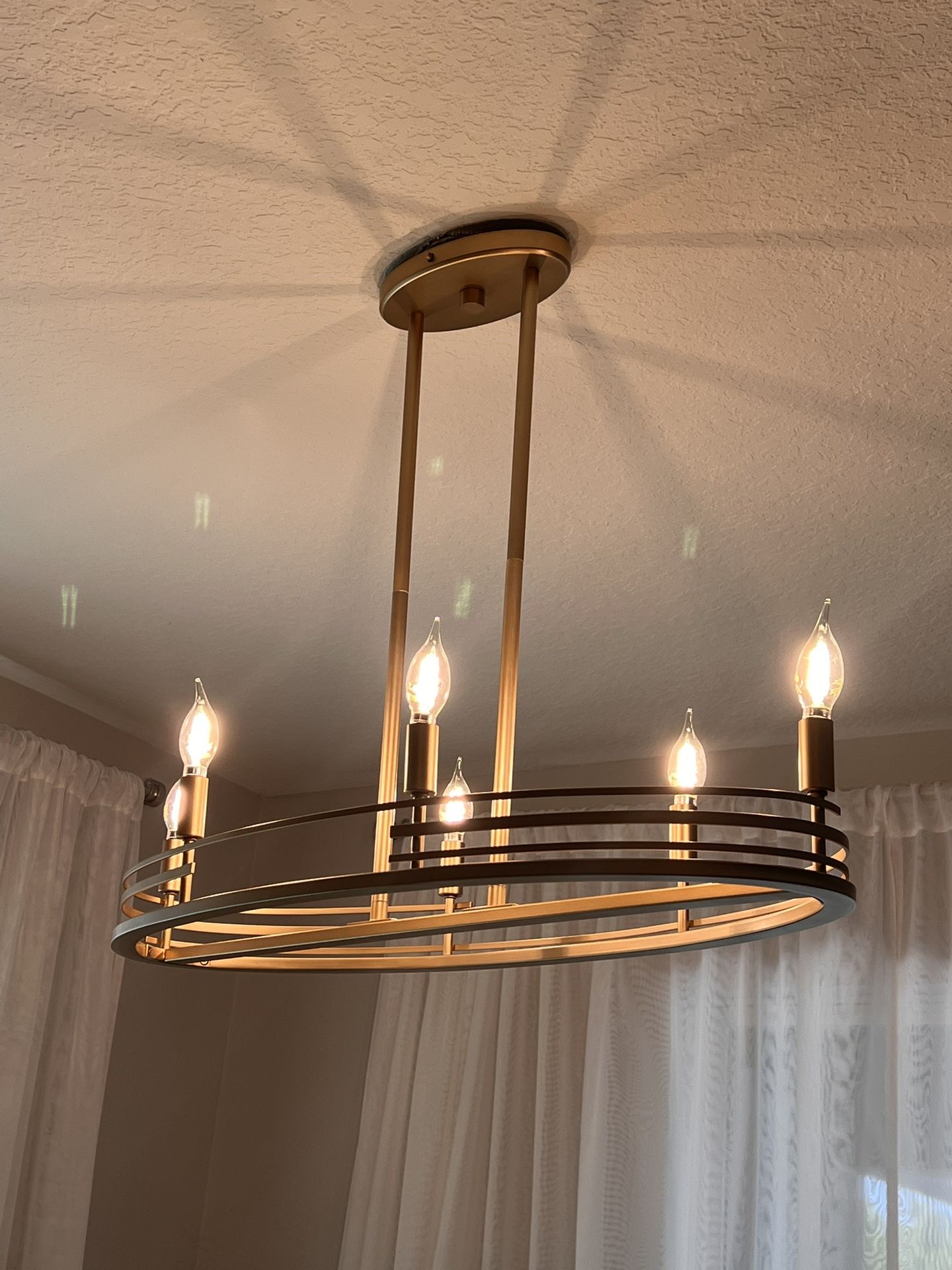 Been assemble and put up for pictures only. In box. Beautiful metal oval chandelier