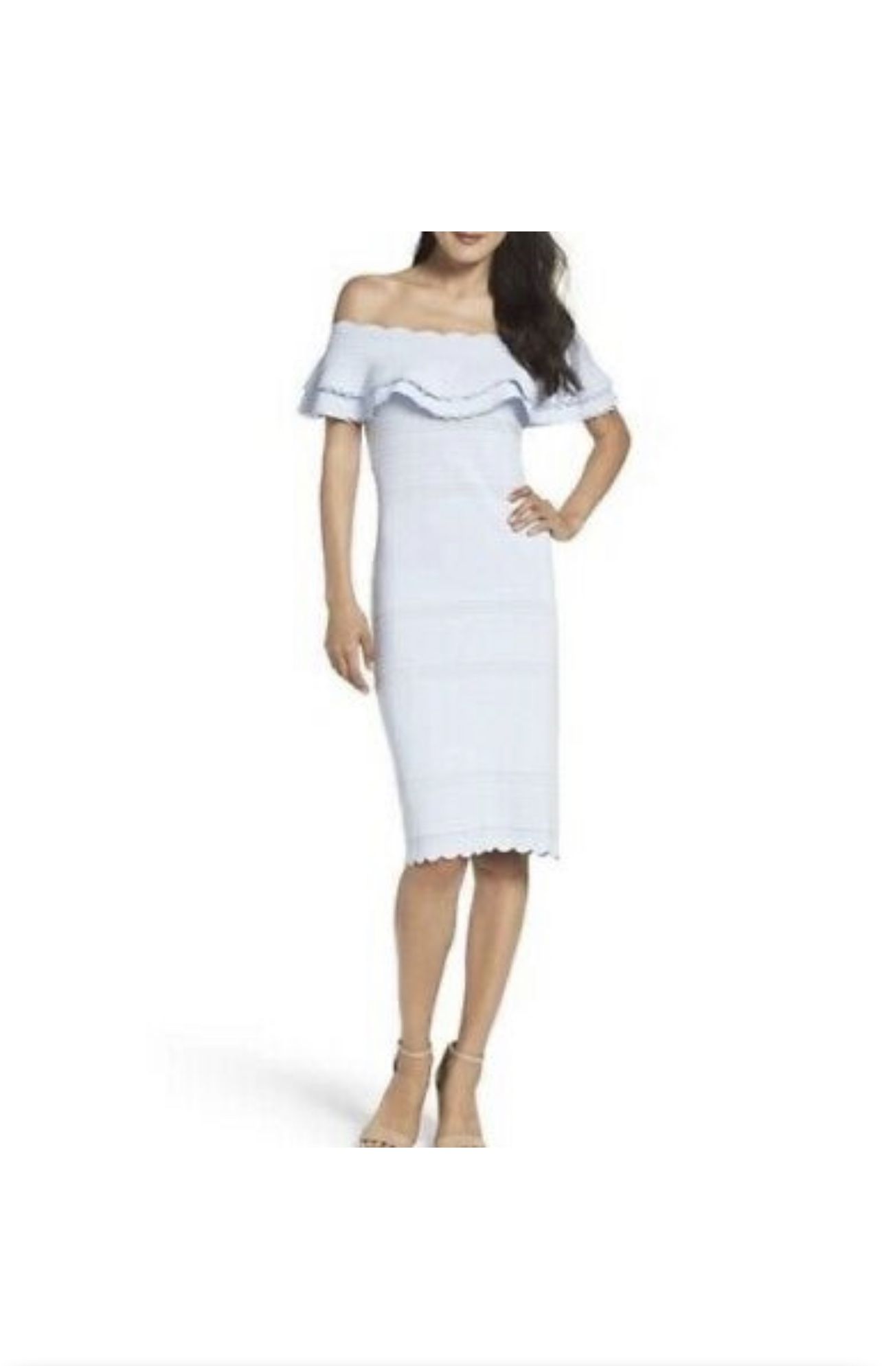 Eliza J Off the Shoulder Sheath Dress. In very good conditions, used only once. It is a Gorgeous dress!!!!!!!!!! In light blue! Bought it at Nordstrom for one occasion only and was perfectly treated! Already Dry Clean! Original price: $188 Pets and Smoke free Home Pick up Only!