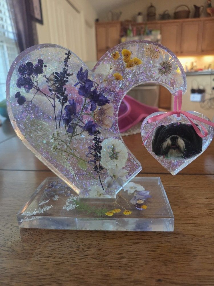 A beautiful piece to honor a pet or loved one, celebrate an anniversary, birthday, wedding, engagement, so many possibilities! Can be customized with your choice of colors and fillers, glitter, flowers, etc. Use your ideas and let me create something special for you!