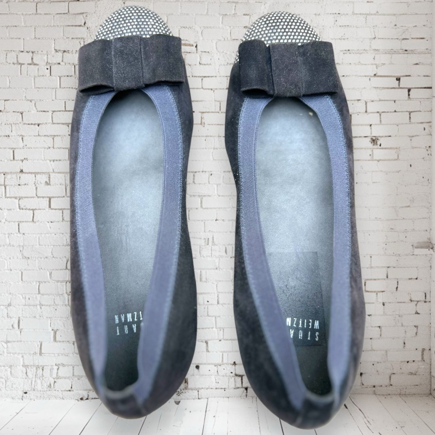 These Stuart Weitzman ballet flats feature a studded suede design in silver, with a bow detail on the toe. They are a size 8 US / 38.5 EU, with a UK size of 6.5. The slip-on style makes them convenient for various occasions like parties, casual outings, or business settings. The flats have a flat heel and a medium width, making them comfortable and stylish for everyday wear.
