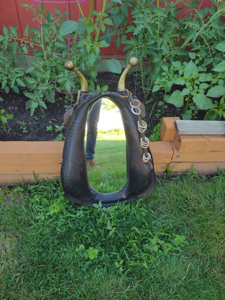 Old leather horse collar with a mirror. Makes a good antique decoration. Was hung in John's Garage restaurant in the Woodfield Mall. It might be around 60 years old.