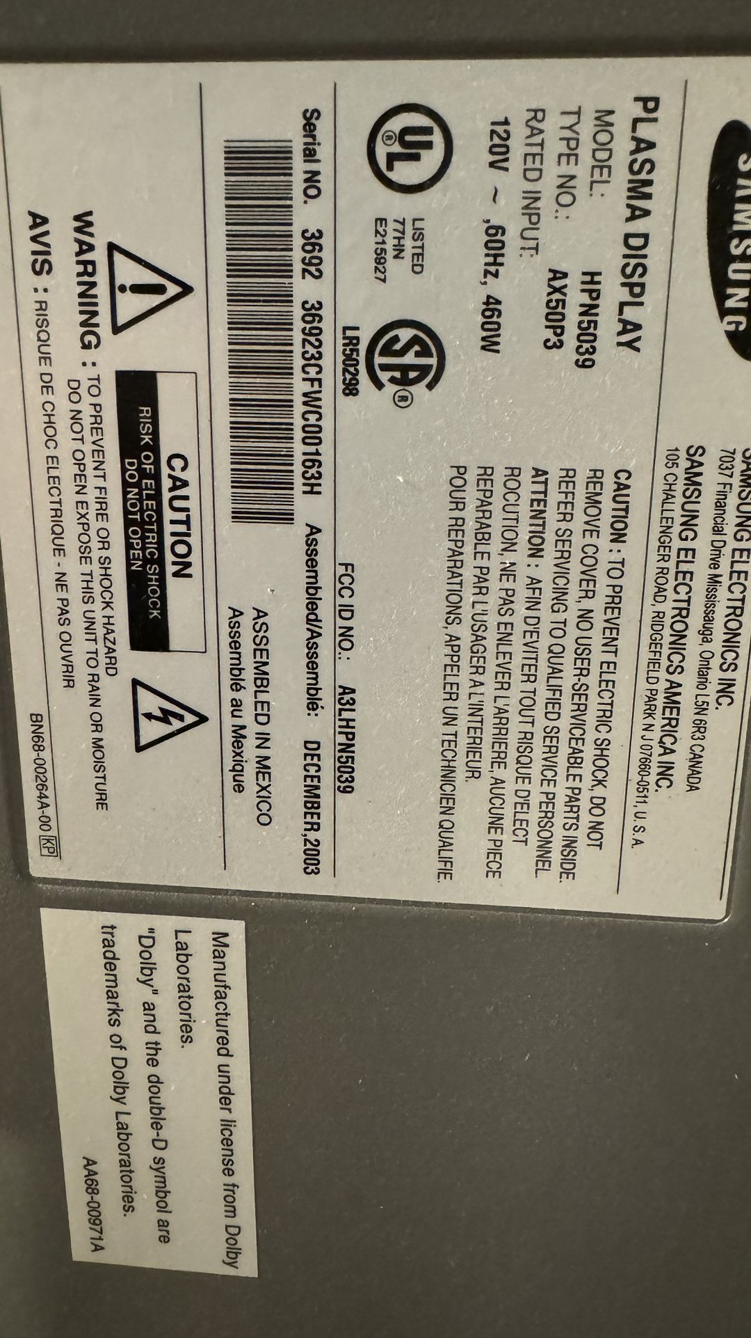50 inch plasma TV for sale.