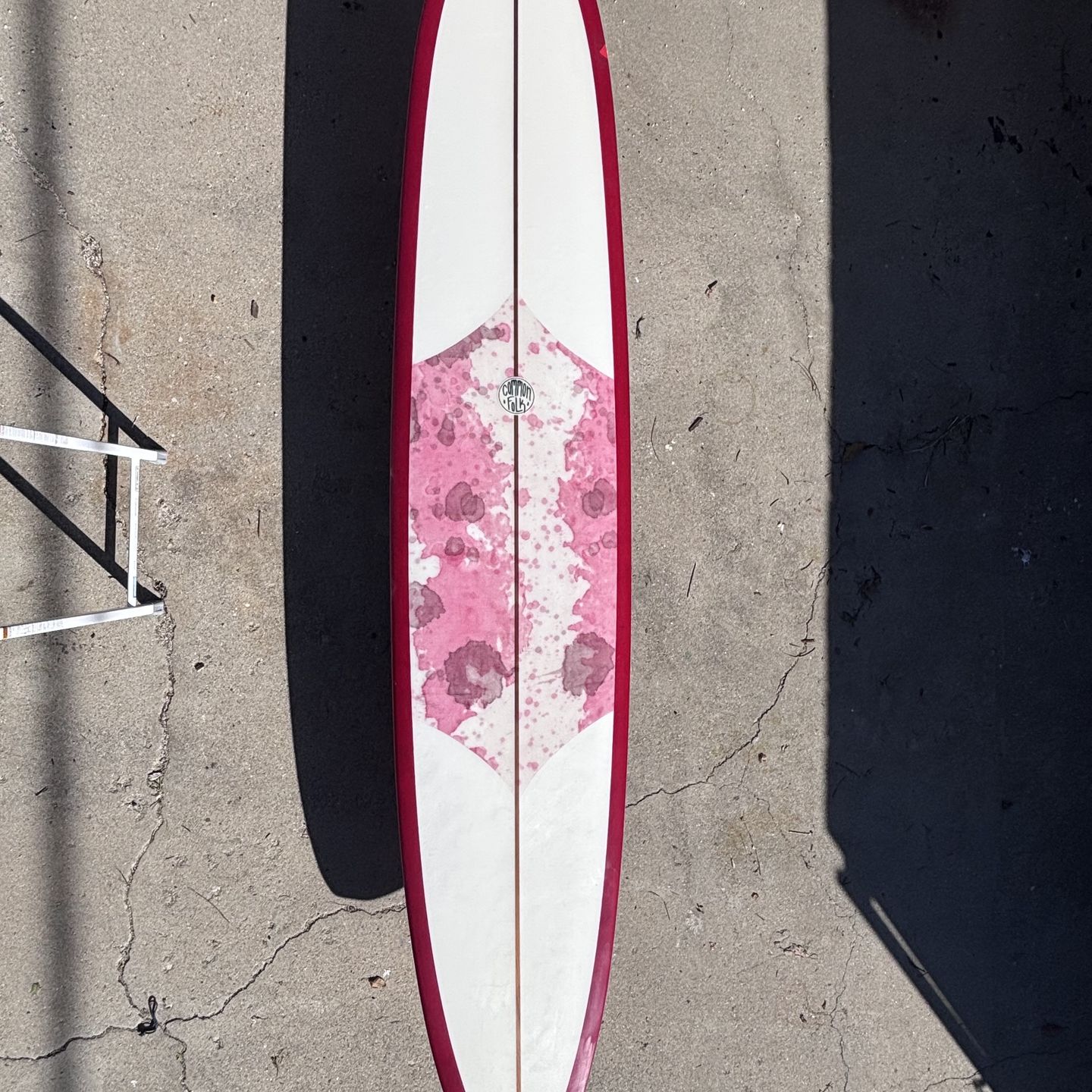 9’7” Common Folk Supply Longboard: Good Condition - Single Fin - Hand Dyed Deck Patch — $450 A personal handshape from (retired) SB shaper, Jeremy Allan, who learned under Ryan Lovelace. This single fin, reverse rocker (Pig-style) longboard, nicknamed “Boardeaux,” is optimal for small, fast waves like those we have in the 805. It has pinched rails and unique flex tail design. The deck patch is hand dyed with wine and adds strength for knee paddlers. It had some damage, which was professional repaired in the tail, but there are still some watertight cracks in the glass. Combining quivers with my girlfriend and needing to make some tough cuts; it will be missed. - 9’7” x ~22” x ~2 ⅞” - Single fin box - PU / Poly construction - Wet sanded gloss finish - Wine colored bottom with hand dyed patch over clear deck - Quarter inch darkwood stringer - No leash plug - Professionally fixed tail and rail ding near nose Jeremy was charging $1,295 for a custom one back in 2021, but given the repairs, I’ll price it at $450. Cash, Venmo, Zelle—no trades. Pickup in Ventura only.