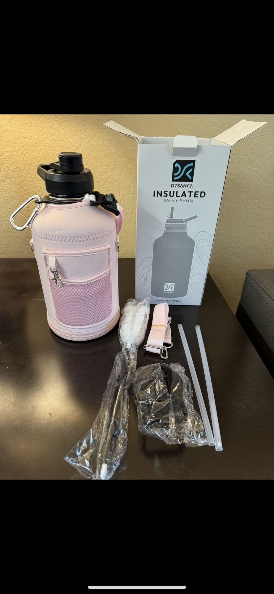 Brand new Dysanky Insulated Water Bottle, Thickened Stainless Steel Vacuum Metal Portable Sports Half Gallon Large Water Jug for Gym and Hiking with Straw, Carrier Bag, Handle Strap | BPA-Free 64 oz