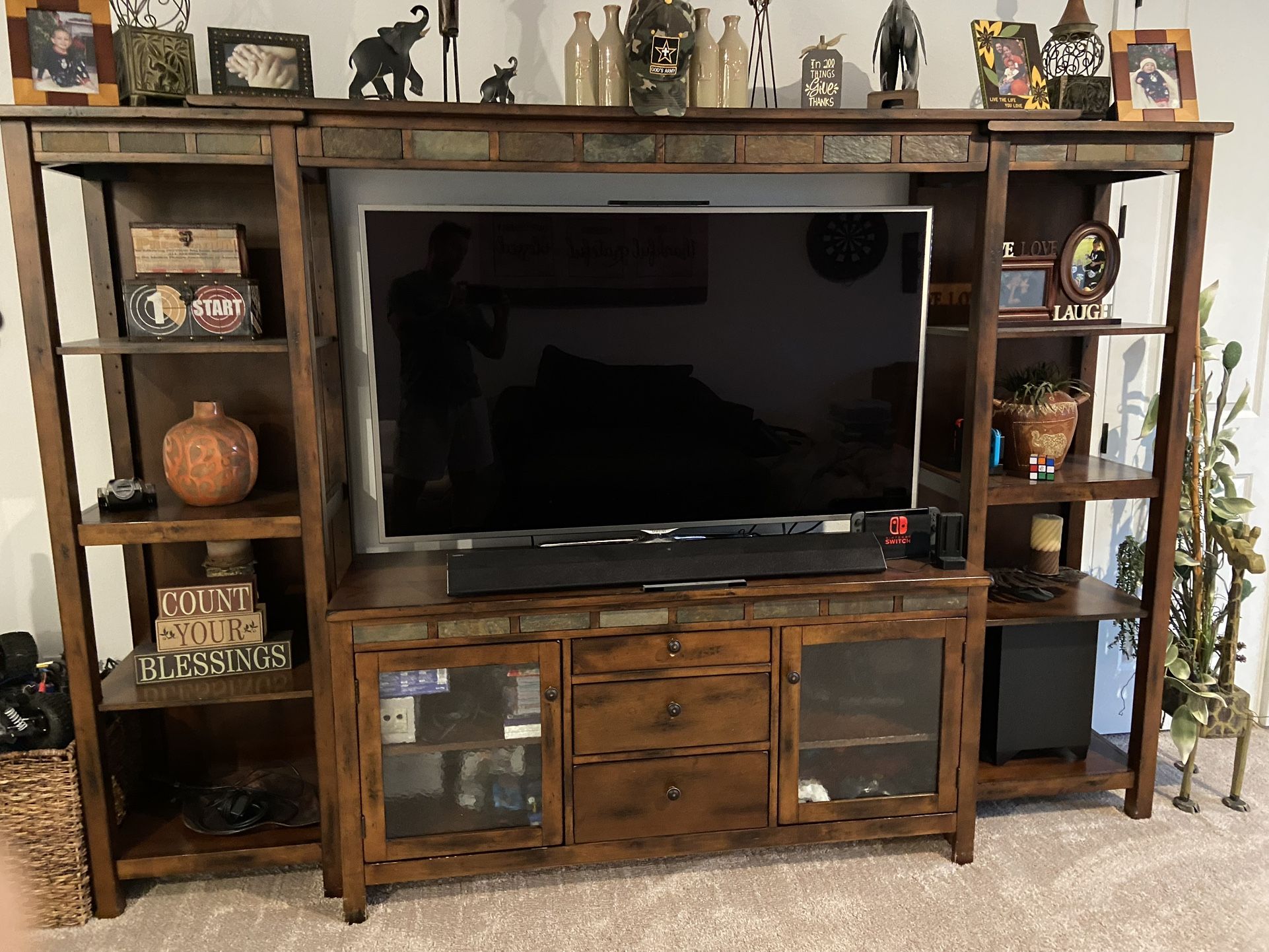 Moving—must go! Best offer takes it. Beautiful, rustic wood entertainment center with a large TV opening, lots of shelving and tons of storage. Base includes two glass door cabinets plus multiple drawers for consoles, games, movies, etc.