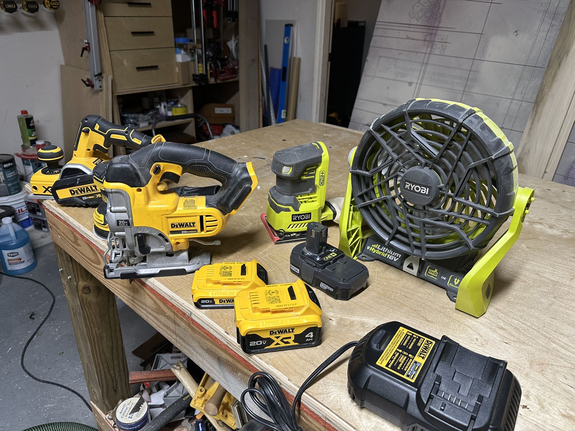 Dewalt Planer M-DCP580 Dewalt Orbital Sander M-DCW210 Dewalt Jigsaw M-DCS331 4AH 20v battery 2AH 20V battery and charger Ryobi 18V Fan and 18V square sander