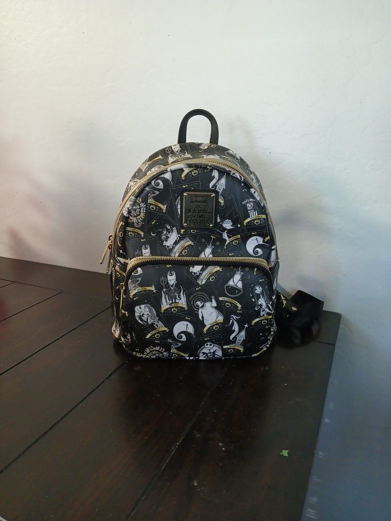Black and white Sally and Jack tarot card Lounge fly backpack with gold zippers. Other characters included on the bag as well. Small interior pocket in the large pocket and a small pocket on the front of the back pack for smaller items