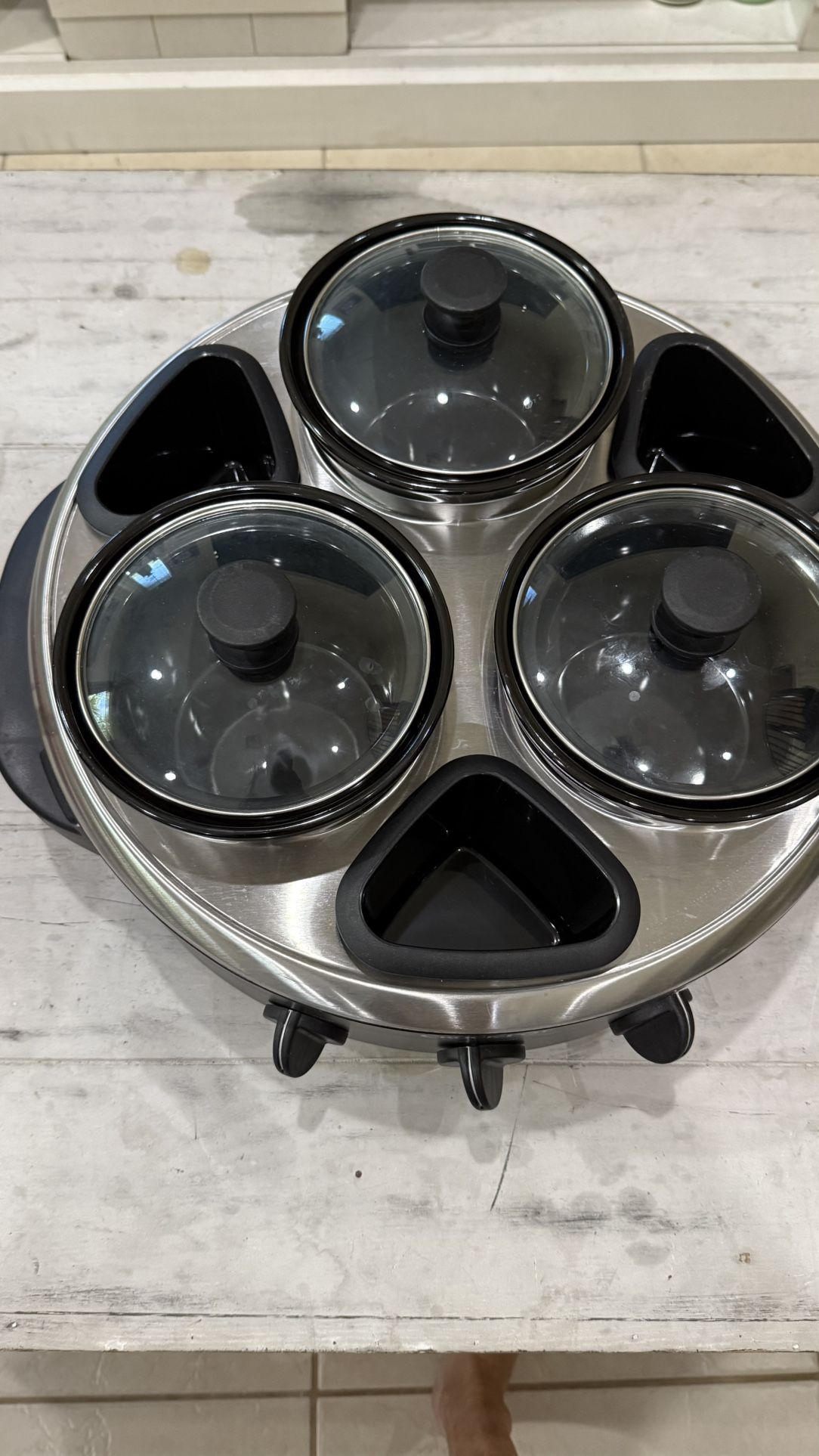 The Crock-Pot Triple Dipper model SCRTD300-BS includes three 1 quart ceramic crocks on a spinning base (Lazy Susan). It features a 360° swivel base. It is a versatile kitchen appliance designed for serving dips or keeping food warm during gatherings. Comes with plastic top cover for easy storing / traveling. This is such a hit item at all parties. Enjoy! Perfect for football party soups and dips!
