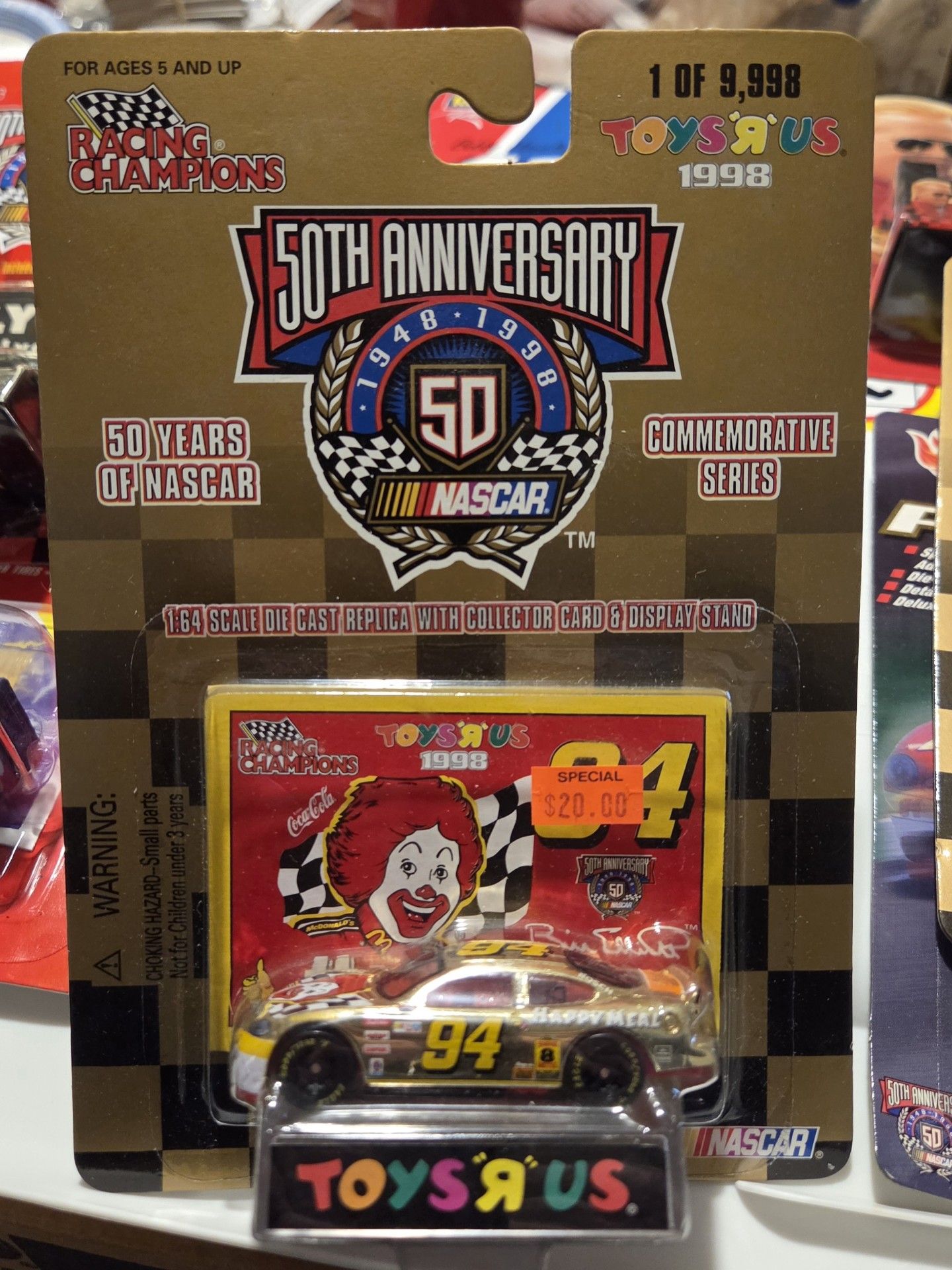 1998 1/64 Nascar 50th # 94 Mcdonalds Happy Meal Bill Elliott (Toys R US )exclusive limited edition 1 of 9998 gold car on original card in excellent condition