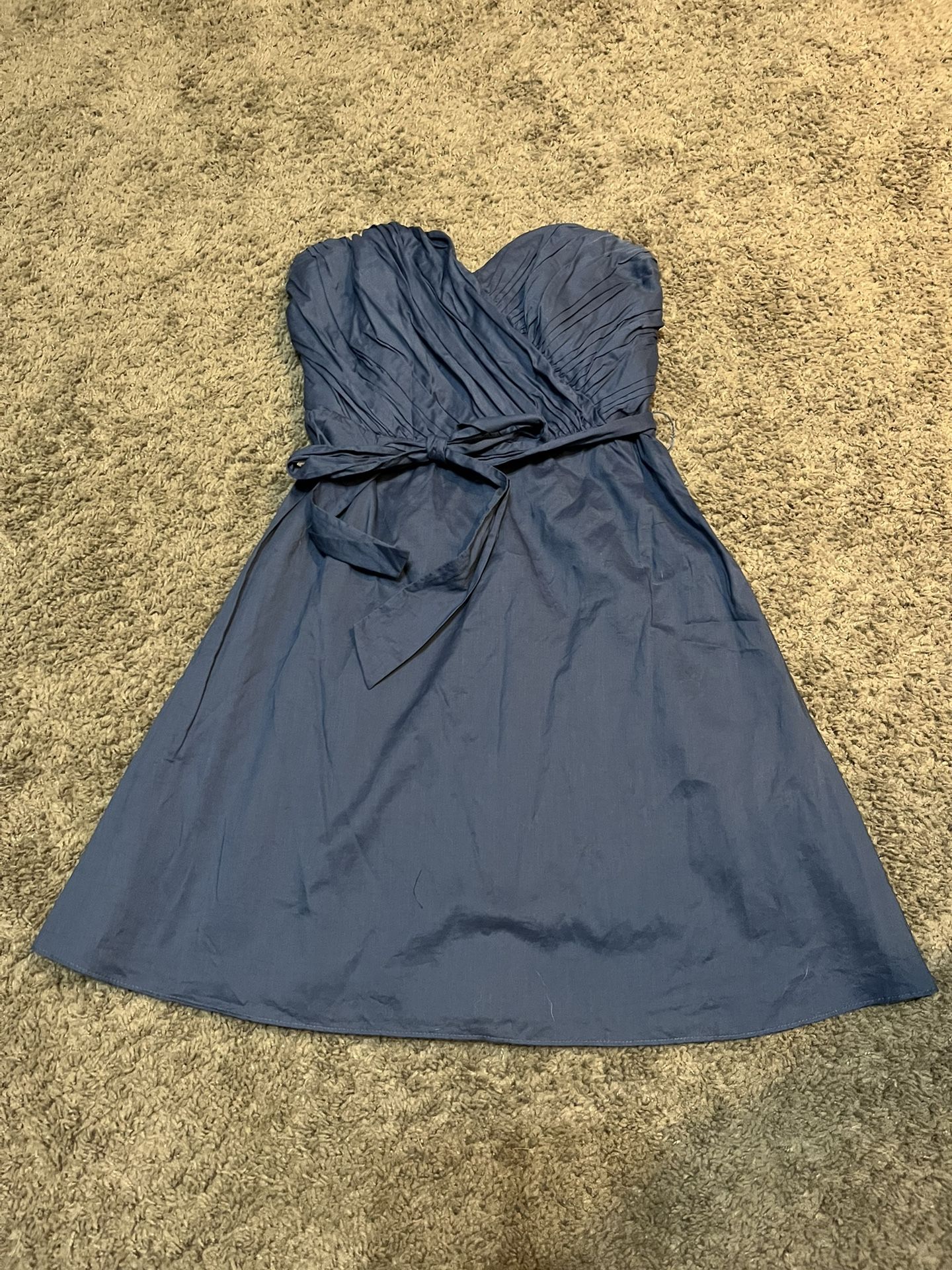 Excellent condition - Express brand, navy blue color, lightweight material with lining. Strapless with a sweetheart neckline, length is above the knee or at the knees depending on your height. Removable belt, ruched detailing on the chest, back has ruched elastic panel, side zipper closure. Size 8.