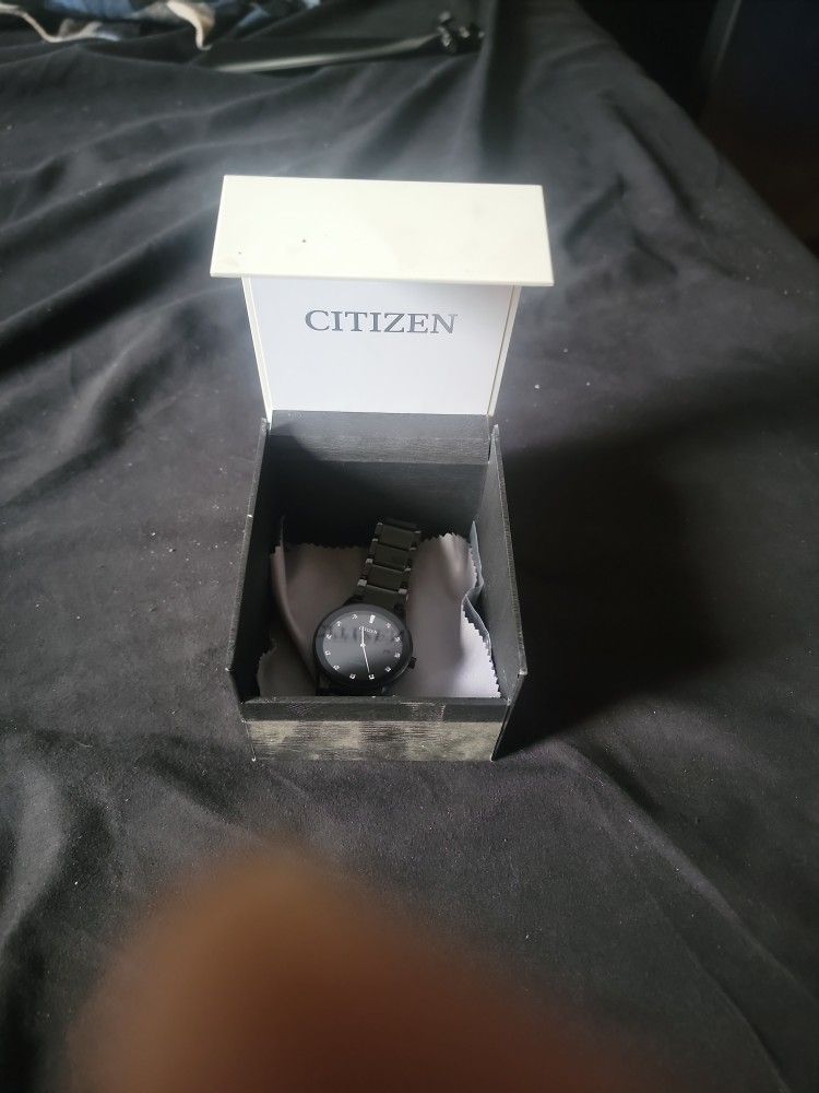 Citizen eco drive timepiece. Self charges in sunlight, or even with incandescent bulbs. Comes with extra links for size adjustment and a cleaning cloth 200 or best offer