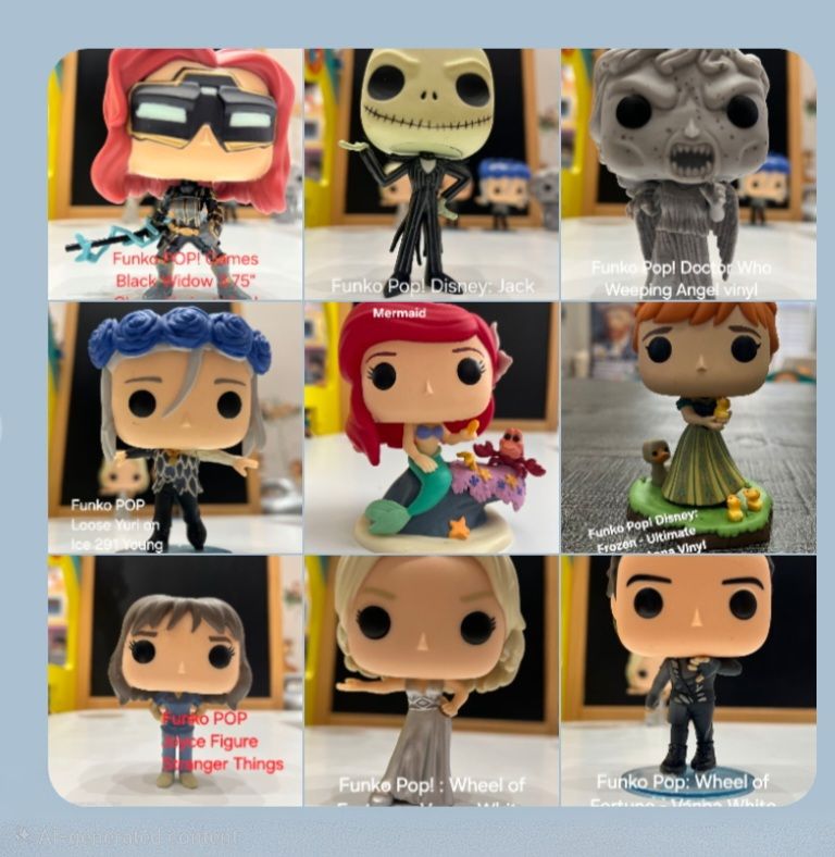 Funko Pop collectible figure lot. Good condition overall. Includes: • Joyce Byers – Stranger Things • Jack Skellington – The Nightmare Before Christmas • Young Victor Nikiforov – Yuri on Ice • Weeping Angel – Doctor Who • Vanna White – Wheel of Fortune • Pat Sajak – Wheel of Fortune • Anna (#1023) – Frozen • Ariel with Sebastian – The Little Mermaid • Barbara Minerva – Wonder Woman 1984 🎁 Black Widow (Marvel) included FREE This one is broken. All figures shown in the photos are included.