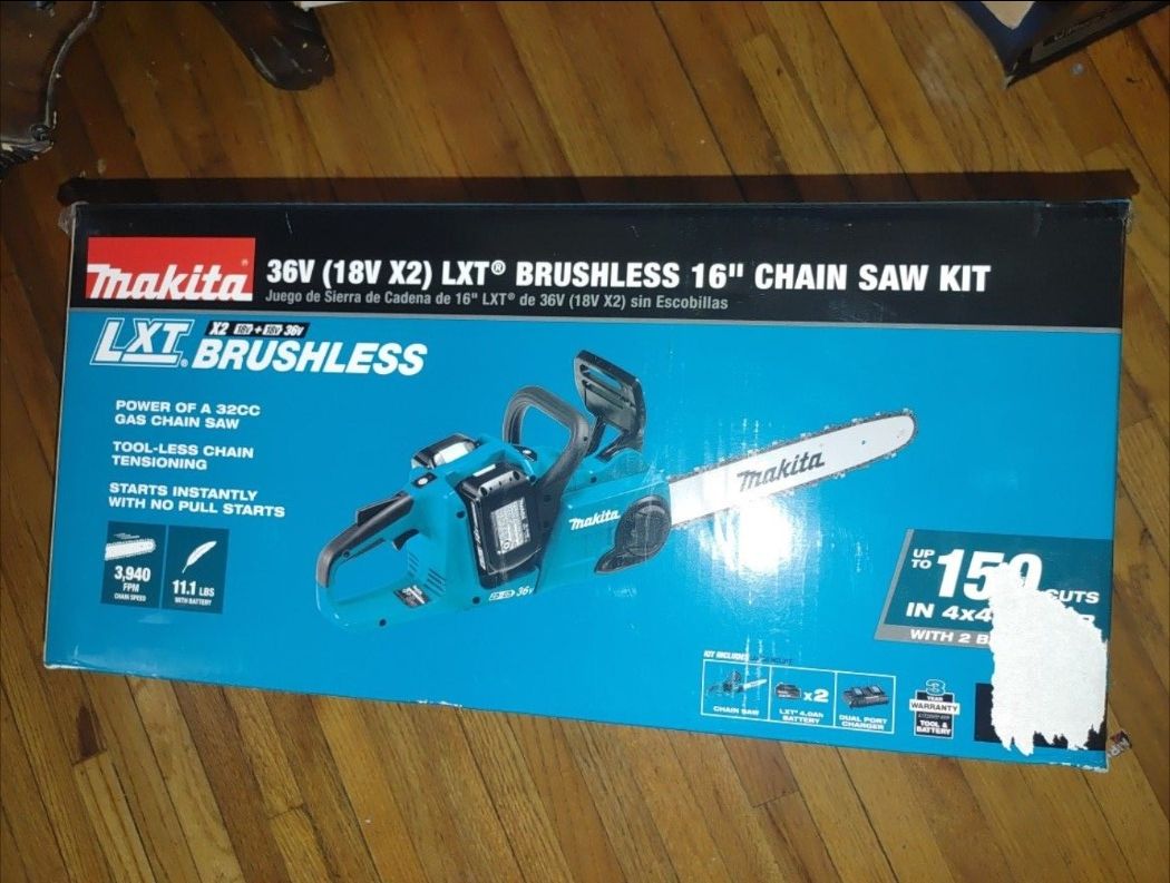 MONEY BACK GUARANTEE Prices are firm, and guaranteed lowest price for any and all (New In Box) items. Brand new in box Makita electric chain saw comes with 2 batteries and charger all new in box.