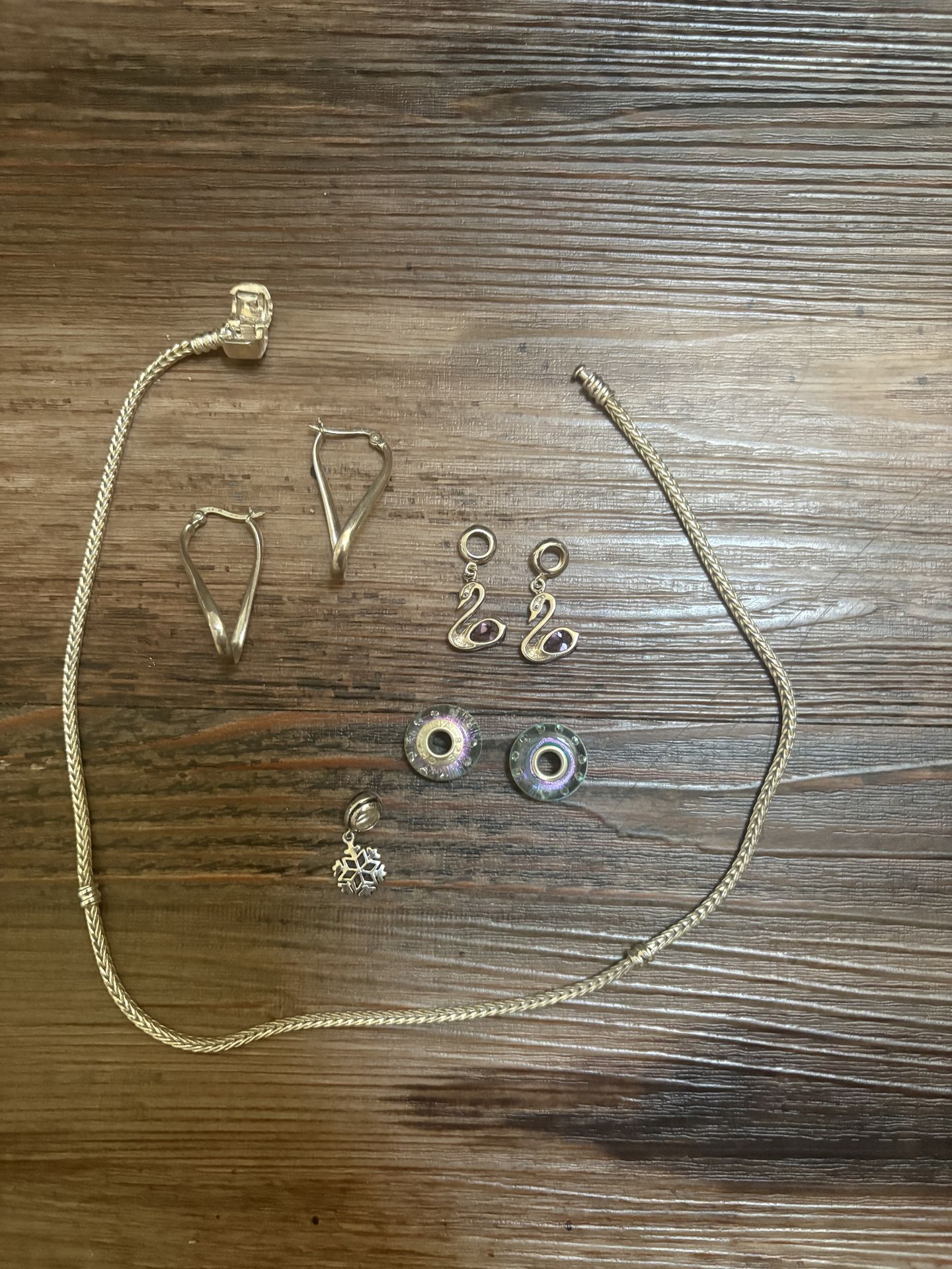 Pandora jewellery set with sterling silver necklace and earrings and five charms to mix and match.