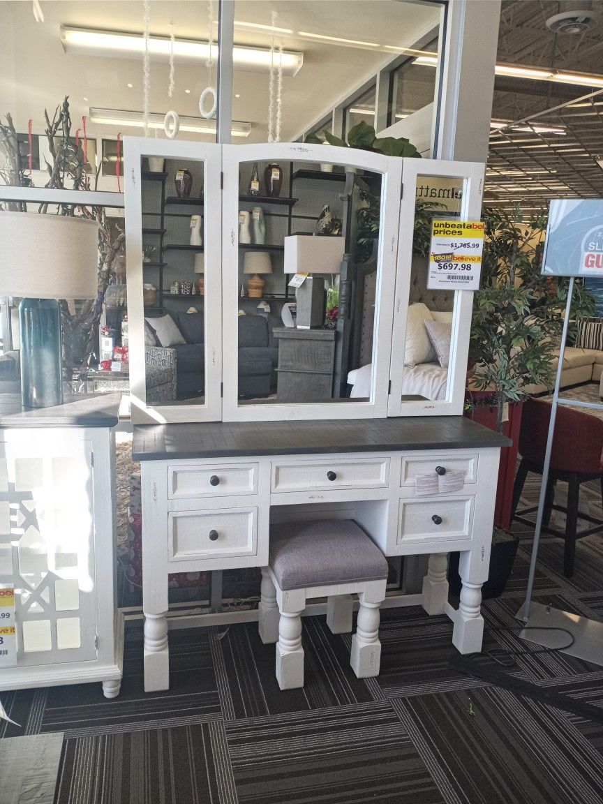 Antique White/ Gray Top Mirror Vanity Vanity Dresser Stool