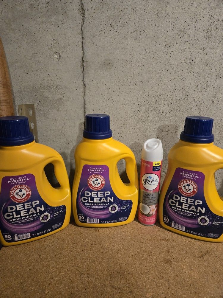 3 Bottles 75oz each Liquid Laundry Soaps Deep Clean Odor Formula & 1 Glade Freshner All for $20 Located in Thornton