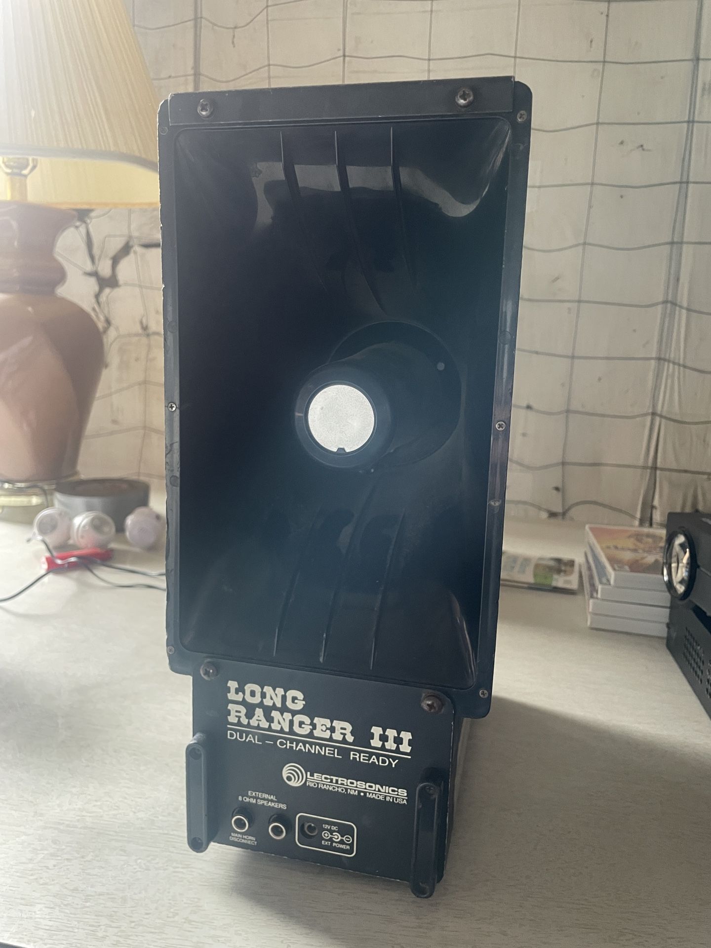 Used Long Ranger II or III Wireless Sound System with new 12V battery and CH40 Charger and case System Range is 750 Feet from Transmitter to Speaker; Will Operate 8-12 Hours on Full Charge; 33 Watts, 8 Ohm Horn Speaker.