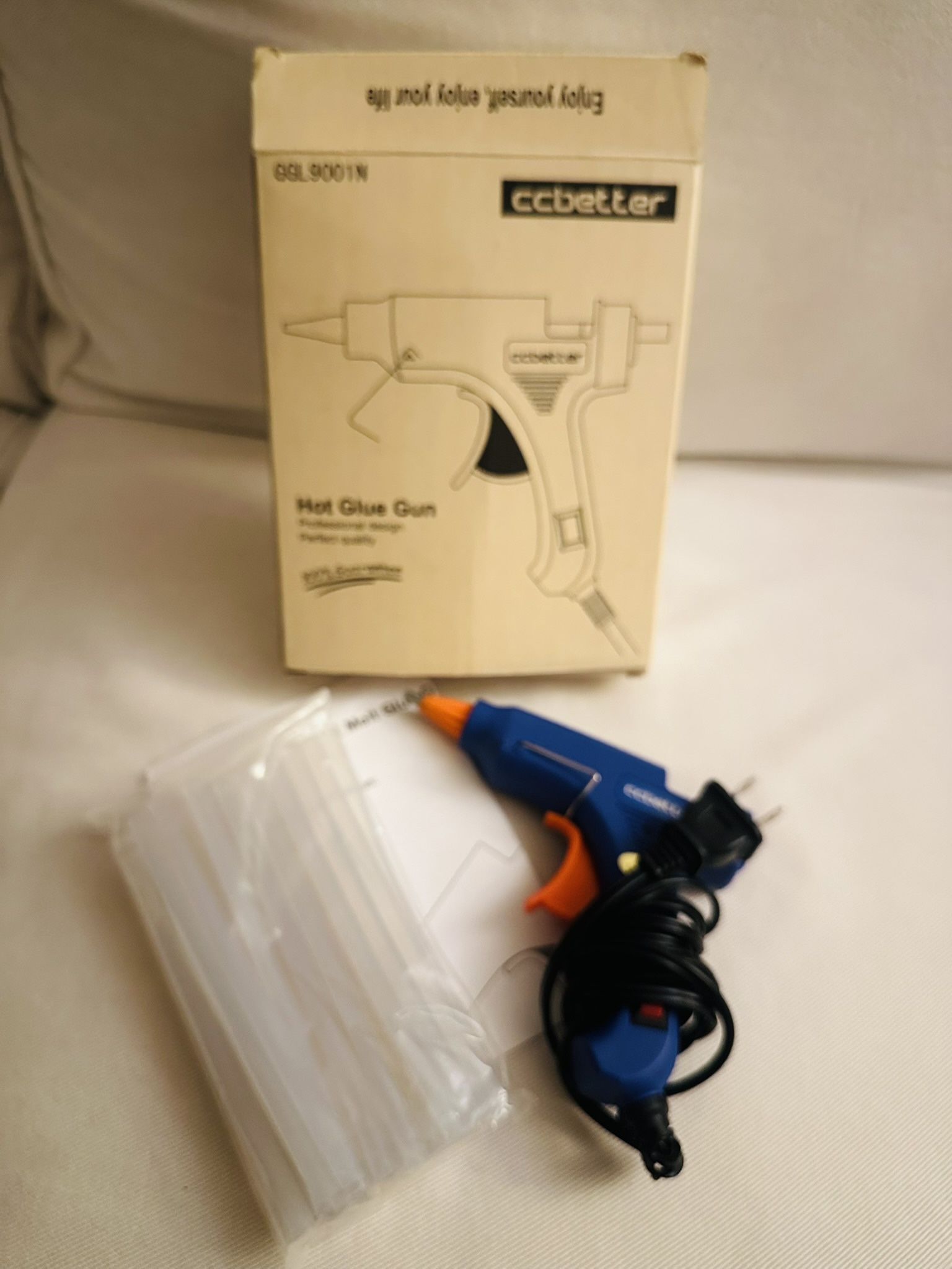 New hot glue gun kit CCBetter GGL9001N Hot Glue Gun. * Working Power: 20W. * Operating Voltage: 100 to 230V. * Warm-up Time: 3-5 minutes. * Features: Includes 29 glue sticks and a 55” cable. Designed for crafts & home repairs.