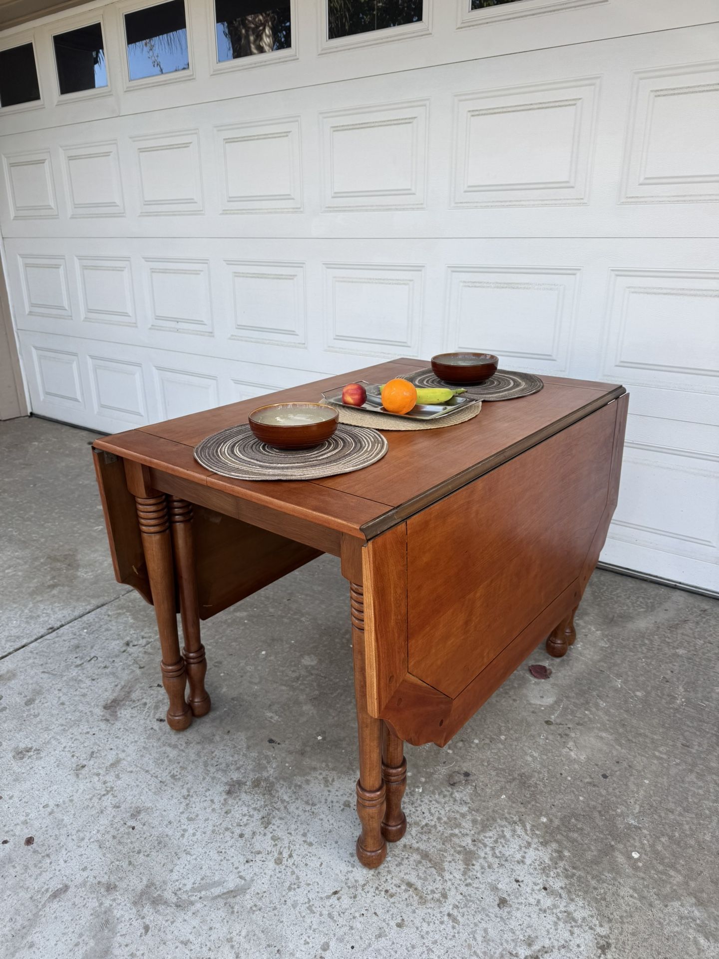 up for sale is a high-quality vintage drop-leaf table. it has a warm, inviting wood grain and a very sturdy build. perfect for someone who loves the vintage aesthetic but needs functional furniture. details: • can be used as a breakfast table, desk, or entryway piece. • the wood has a lovely glow; i've kept it clean and well-maintained. • minor cosmetic wear consistent with its age, but very hard to see. price and logistics • price: $190 obo • pickup in otay mesa or i can deliver it to you for $1 per mile. dimensions • length: 67 1/4 inches/ 27inch drop-leaf • width: 42 inches • height: 30 inches cash/zelle/venmo preferred