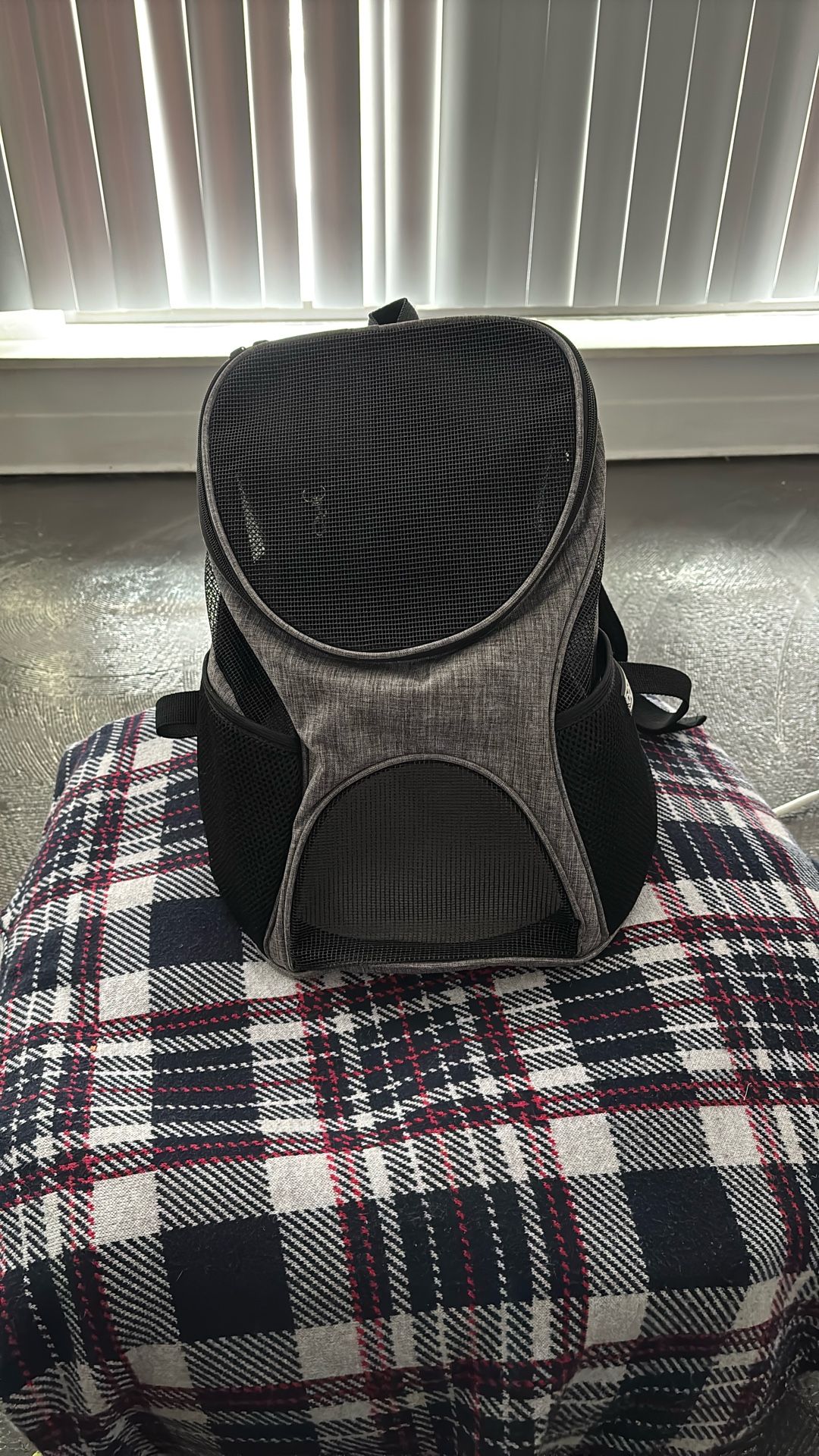 Grey, like new, Dog Line brand dog backpack for small dog or cat. Airline approved sift side pet carrier backpack L 8.5 W 11.6 H 13.8