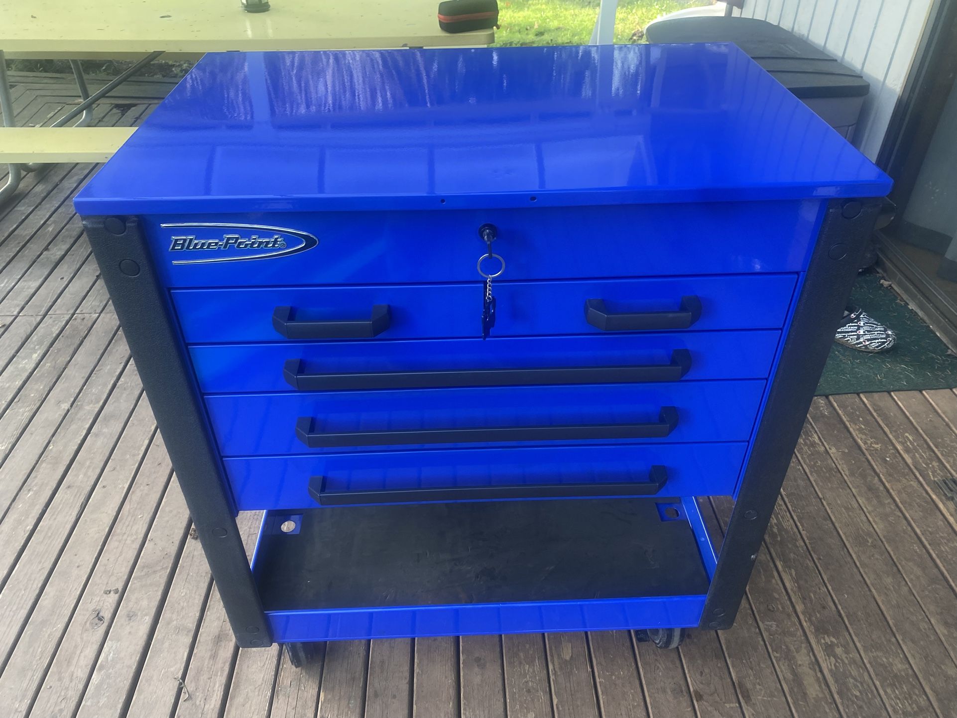 Great condition Blue-Point toolbox with five drawers and power strip. Comes with folding side tray and detachable paint can tray. All fully rotating casters with two locking.