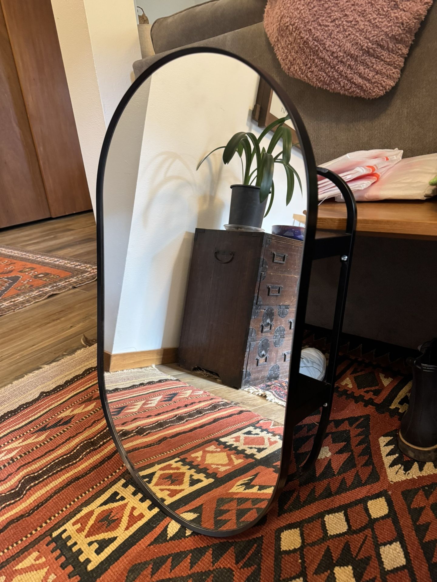 Lindbyn model IKEA bathroom mirror with two shelves and hooks for storage behind the mirror. Missed the return window and not working out in our space. 27.5” t 15.75 w 5.25” d