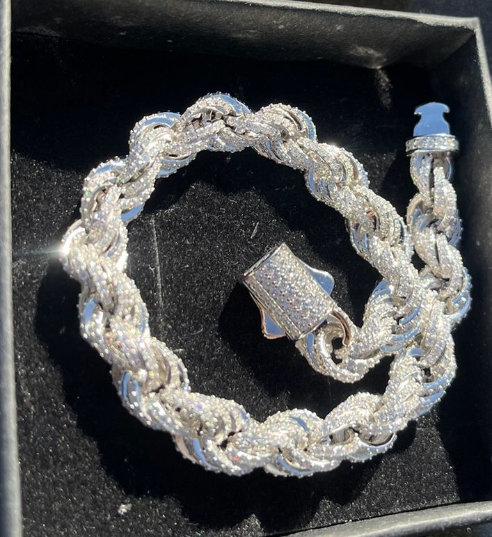 Beautiful moissanite diamond rope bracelet, this bracelet has hand set and selected stones bust down throughout the entire bracelet all set to perfection, this particular piece is solid 925 silver with amazing weight to it, this piece is 14k stamped and measures 7.5 inches in length which is pretty much the universal size, each stone passes the diamond tester no problem we will test stones for our customers in person no problem, this particular style is much more difficult to ice out in comparison to a Cuban bracelet, we are asking $600 message us if interested π