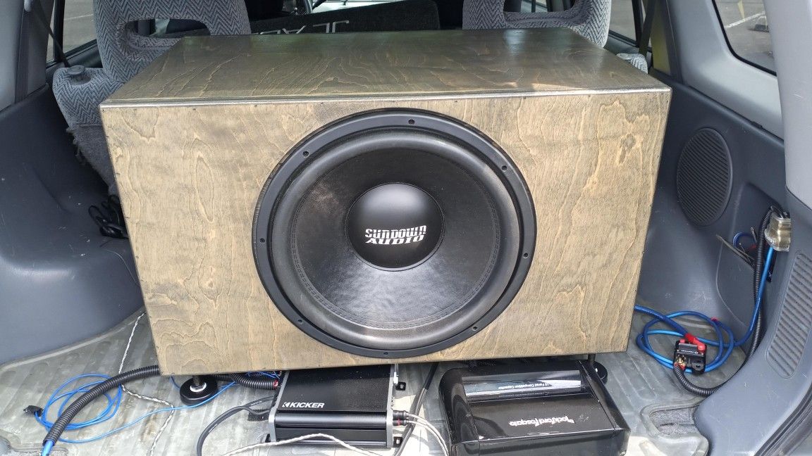 SUBWOOFER NOT INCLUDED This is my 15-in handcrafted stained birch subwoofer enclosure. This has a 6-in aero port, SMD terminal with sky High OFC wire, two wires going off the SMD terminal 1 per coil, it is stained with walnut, it has 3 in feet installed, this makes it great cuz you're amplifier can sit under it or you can hide wires plus it's not sitting right on the floor of your car so you don't hear the car rattle as much You just get nice clean sound. 3 cubic feet. Free delivery in the Portland Vancouver area