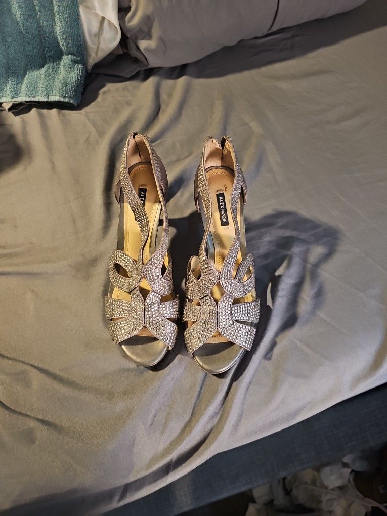 Jeweled dress shoes, silver with clear stones. Short heels