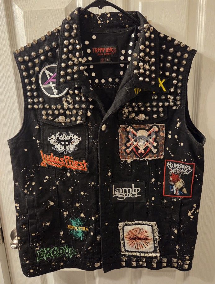 customized Tripp NYC studded punk denim vest adorned with patches from various heavy metal bands. The vest has a distressed, black denim look with white paint splatters and extensive silver studding on the collar, shoulders, and along the front pockets. Size Large